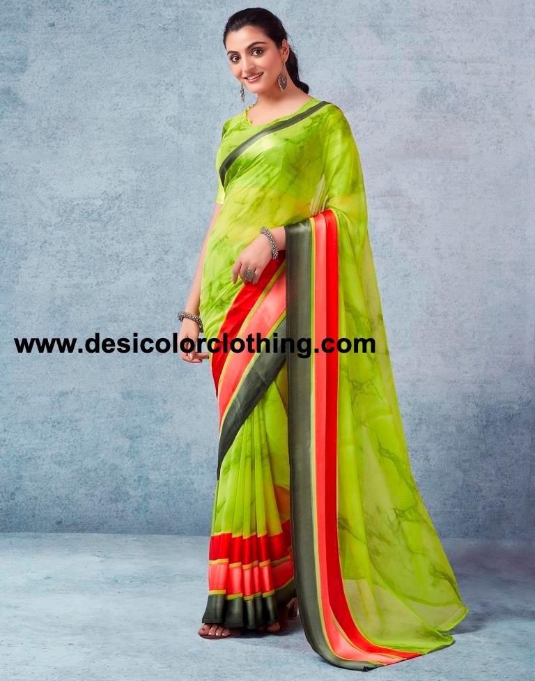 Blouse Color:Parrot Green Blouse Fabric:Georgette Blouse Length:0.80 Mtr Blouse Work:Printed, Satin Patta Saree Color:Parrot Green Saree Fabric:Georgette Saree Length:5.50 Mtr Saree Work:Printed, Satin Patta, Zari Stripe