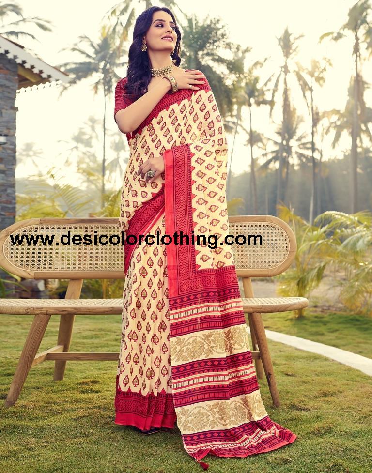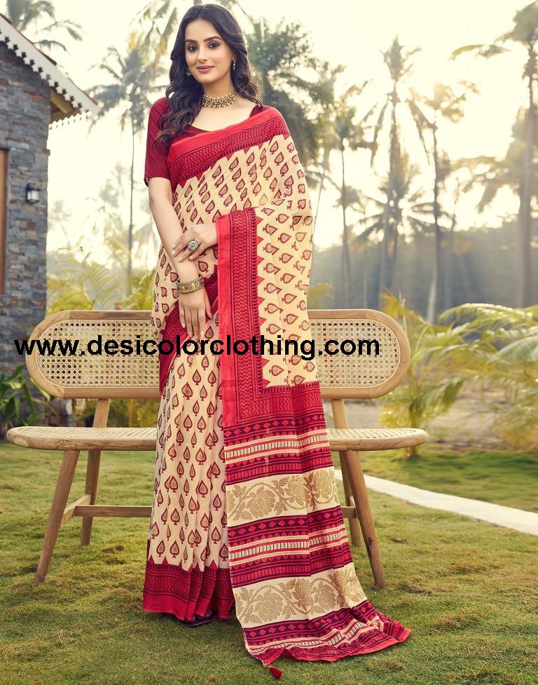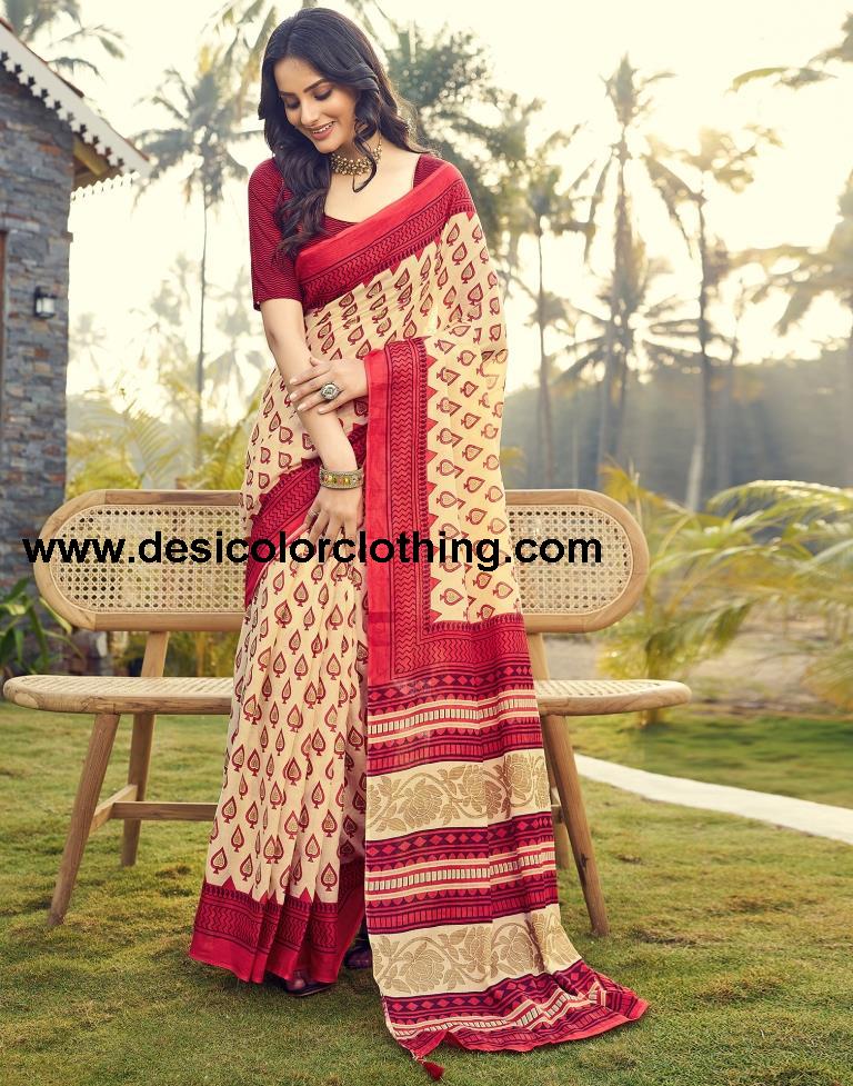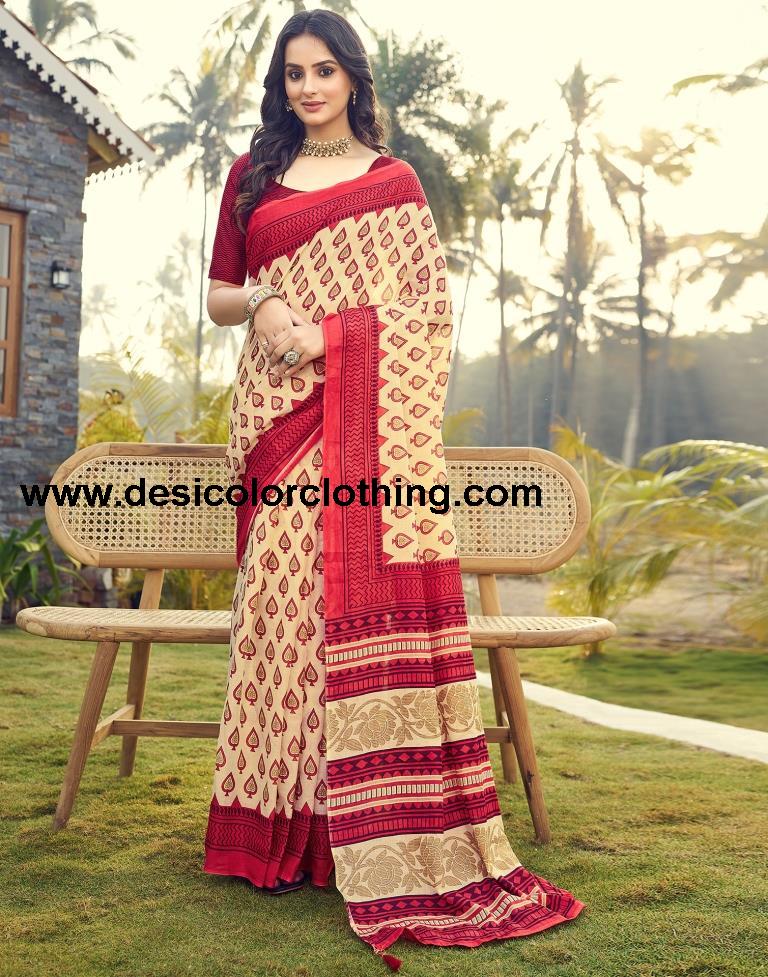 Blouse Color:Red Blouse Fabric:Cotton Blouse Length:0.70 Mtr Blouse Work:Printed Saree Color:Pastel Yellow Saree Fabric:Cotton Saree Length:5.30 Mtr Saree Work:Printed, Tassels, Ready To Wear