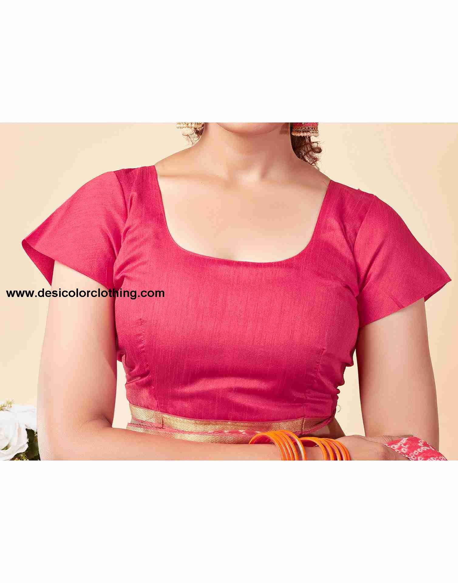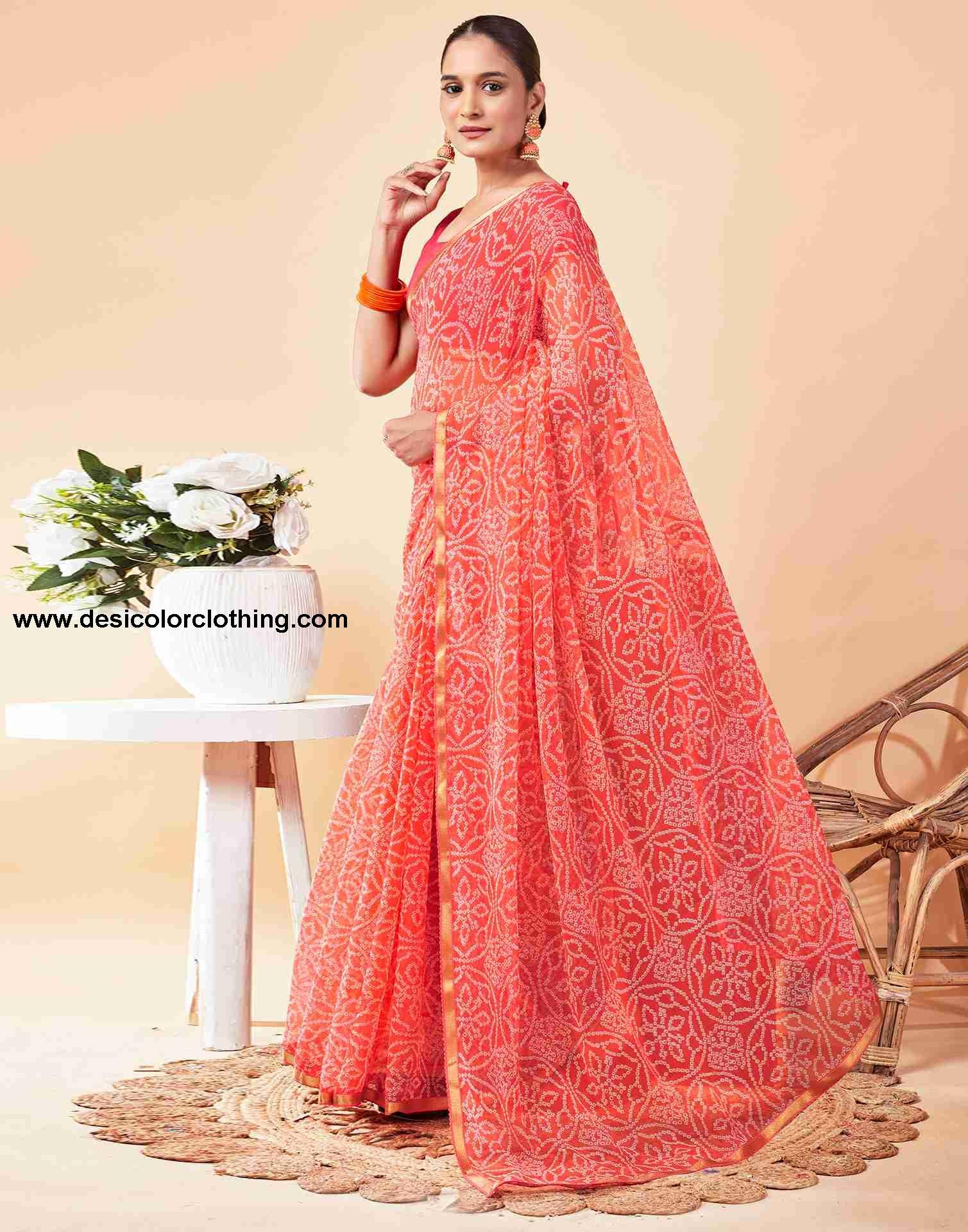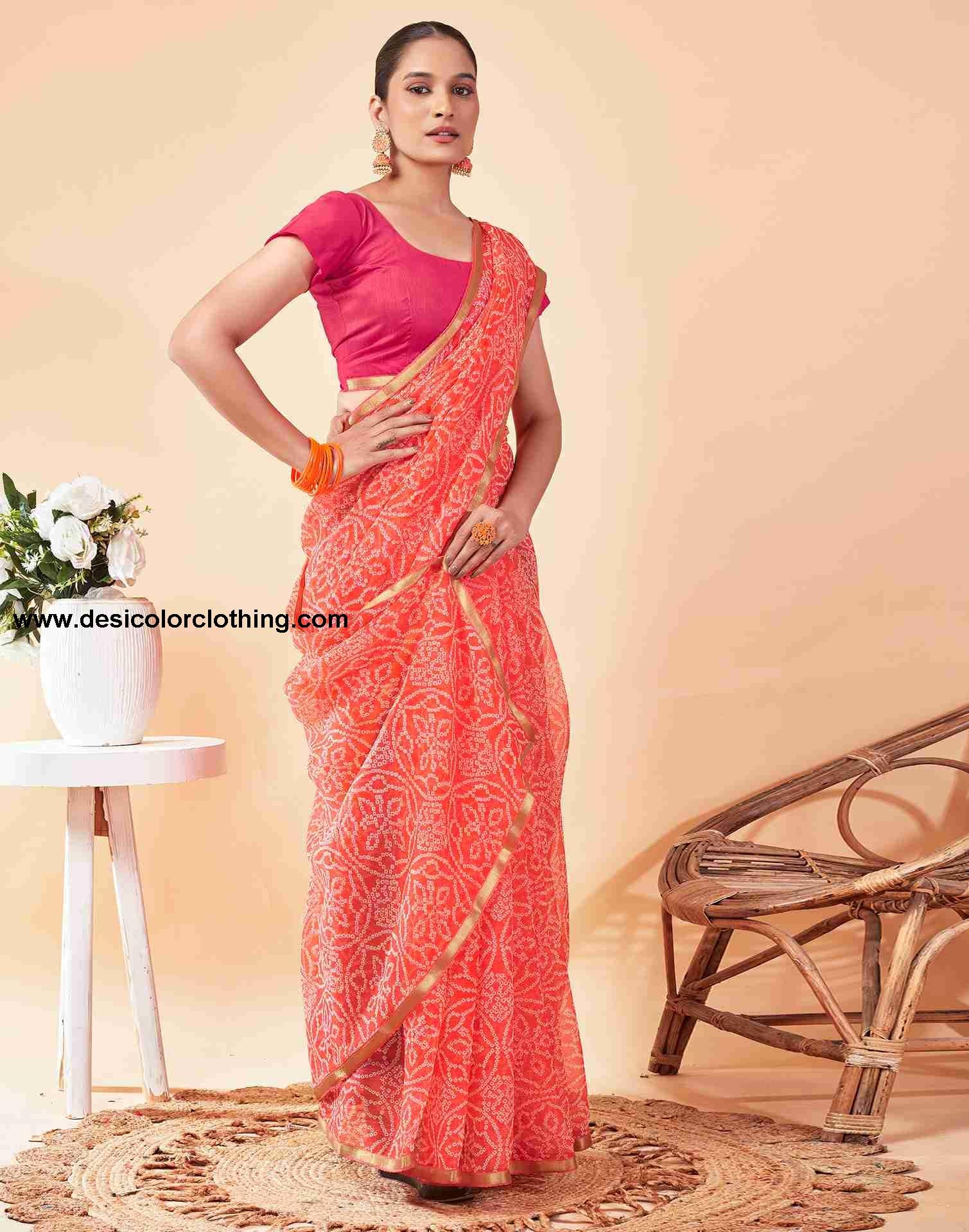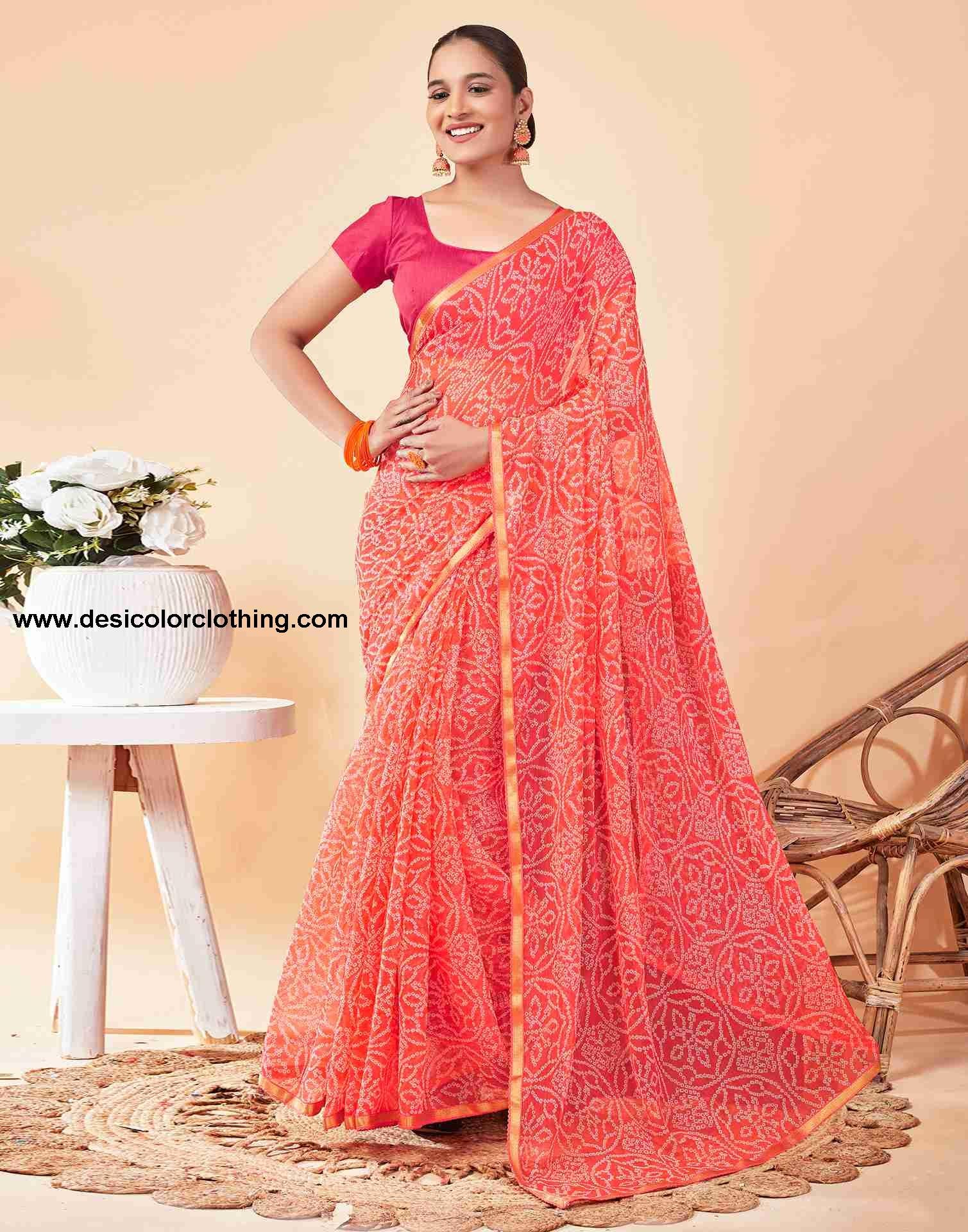 Blouse Color:Dark Pink Blouse Fabric:Bhagalpuri Silk Blouse Length:0.80 Mtr Blouse Work:Plain, Lace Saree Color:Peach, White Saree Fabric:Chiffon Saree Length:5.50 Mtr Saree Work:Bandhani Printed, Lace