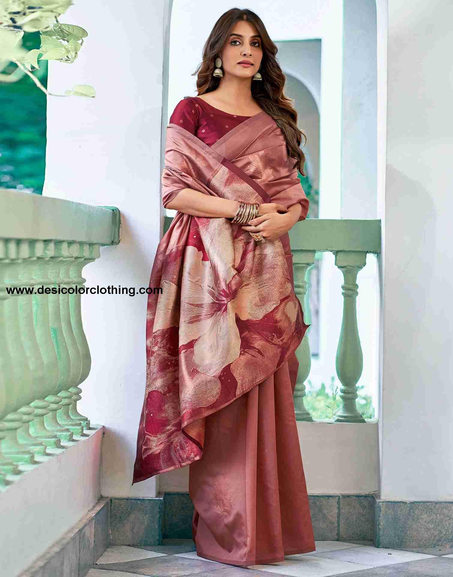 Blouse Color:Maroon, Copper Blouse Fabric:Silk Blouse Length:0.80 Mtr Blouse Work:Plain, Woven Saree Color:Dark Peach, Maroon, Multi Saree Fabric:Silk Saree Length:5.50 Mtr Saree Work:Plain, Woven