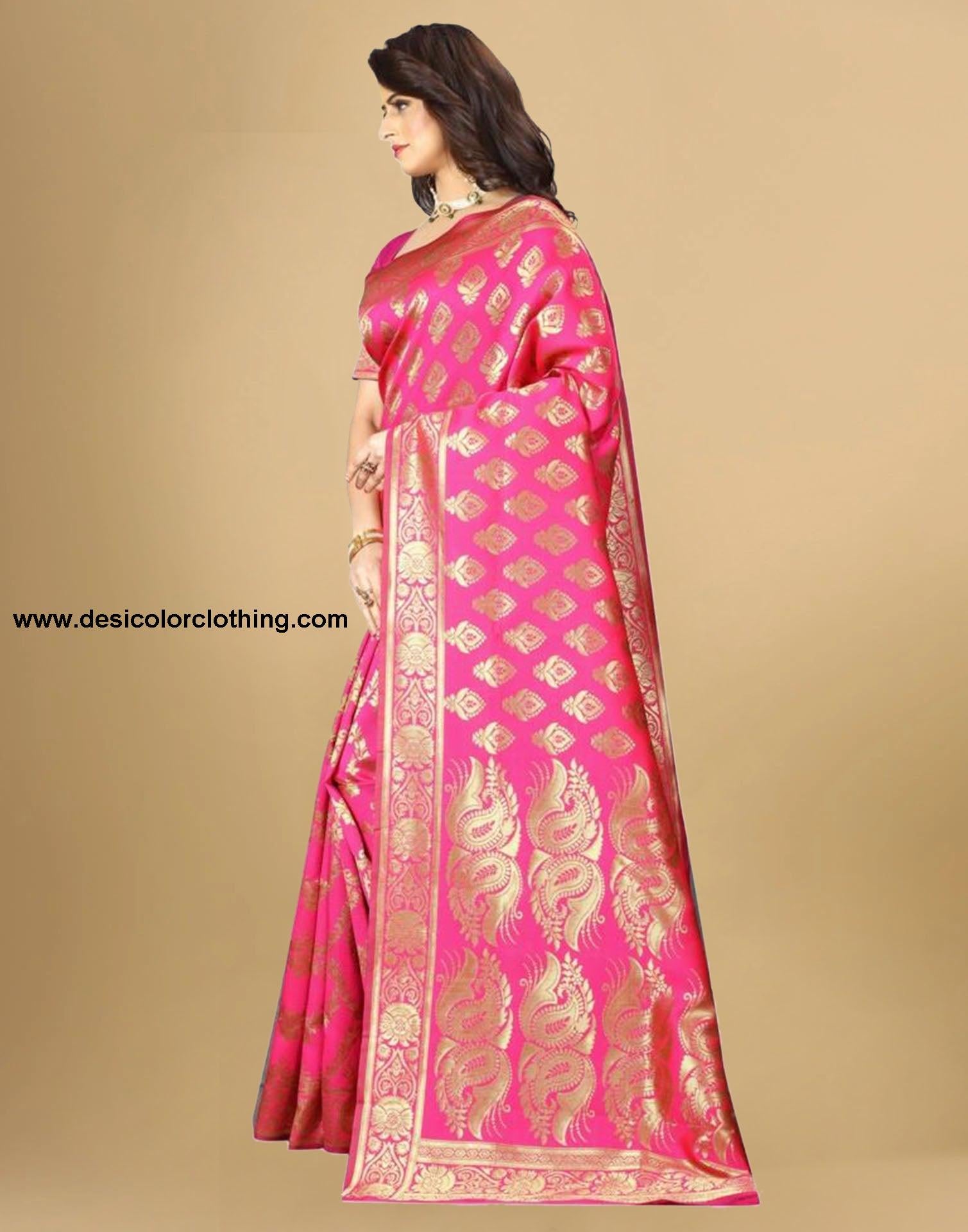 Blouse Color:Pink Blouse Fabric:Polysilk Blouse Length:0.80 Mtr Blouse Work:Jacquard Border, Self Woven Saree Color:Pink, Gold Saree Fabric:Polysilk Saree Work:Jacquard Type:Banarasi