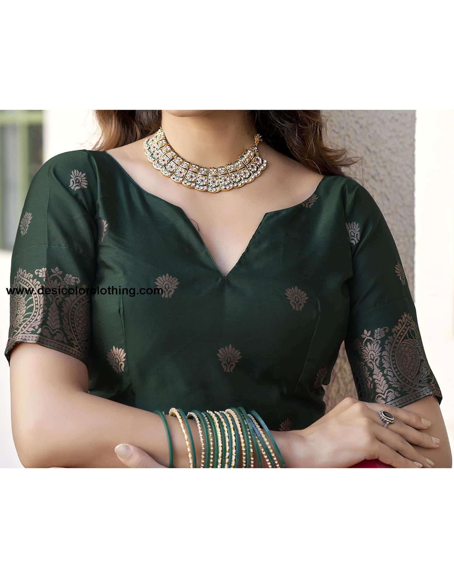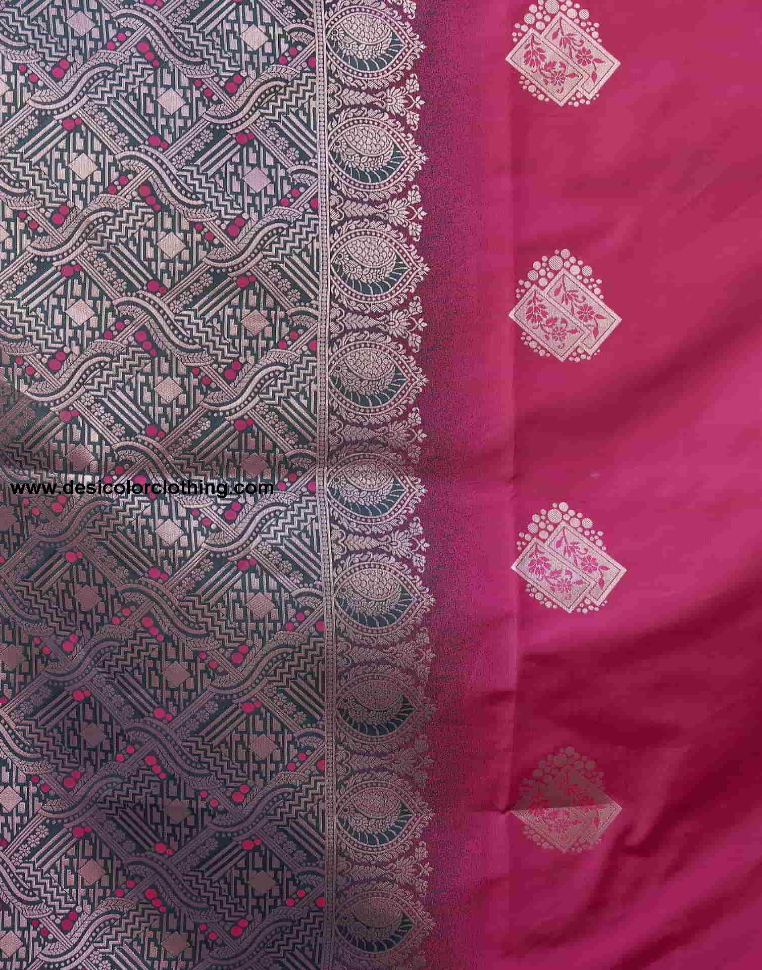 Blouse Color:Dark Green, Golden Blouse Fabric:Silk Blend Blouse Length:0.80 Mtr Blouse Work:Plain, Woven Work Saree Color:Dark Pink, Dark Green, Golden Saree Fabric:Silk Blend Saree Length:5.30 Mtr Saree Work:Plain, Woven Work Type:Banarasi