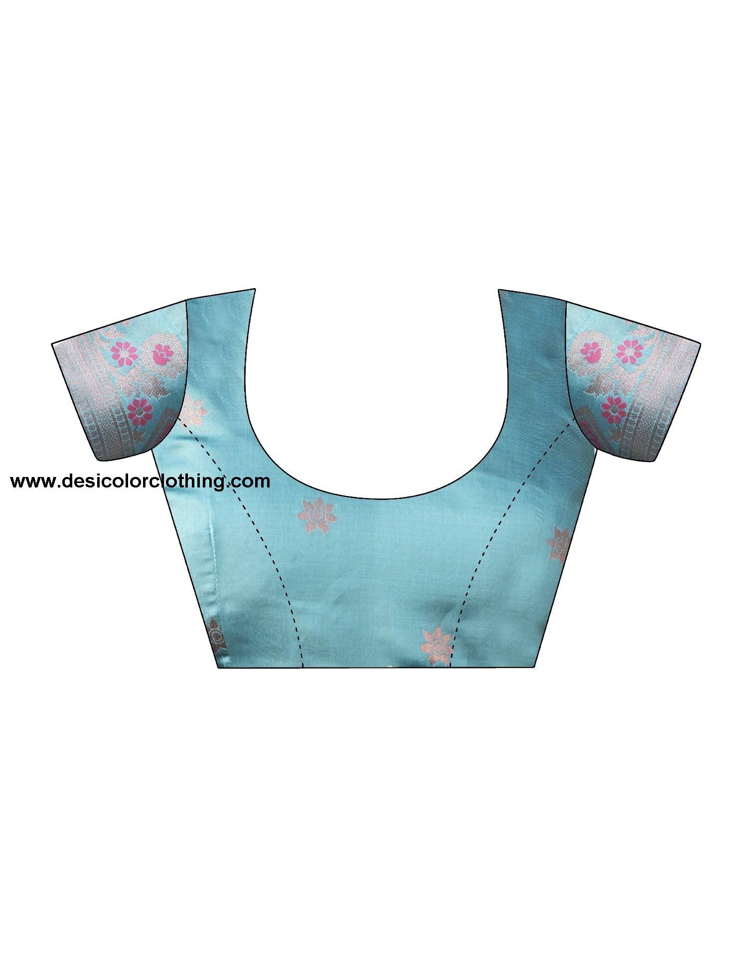 Blouse Color:Blue, Golden Blouse Fabric:Silk Blend Blouse Length:0.80 Mtr Blouse Work:Plain, Woven Saree Color:Pink, Blue, Golden Saree Fabric:Silk Blend Saree Length:5.30 Mtr Saree Work:Plain, Woven Type:Banarasi