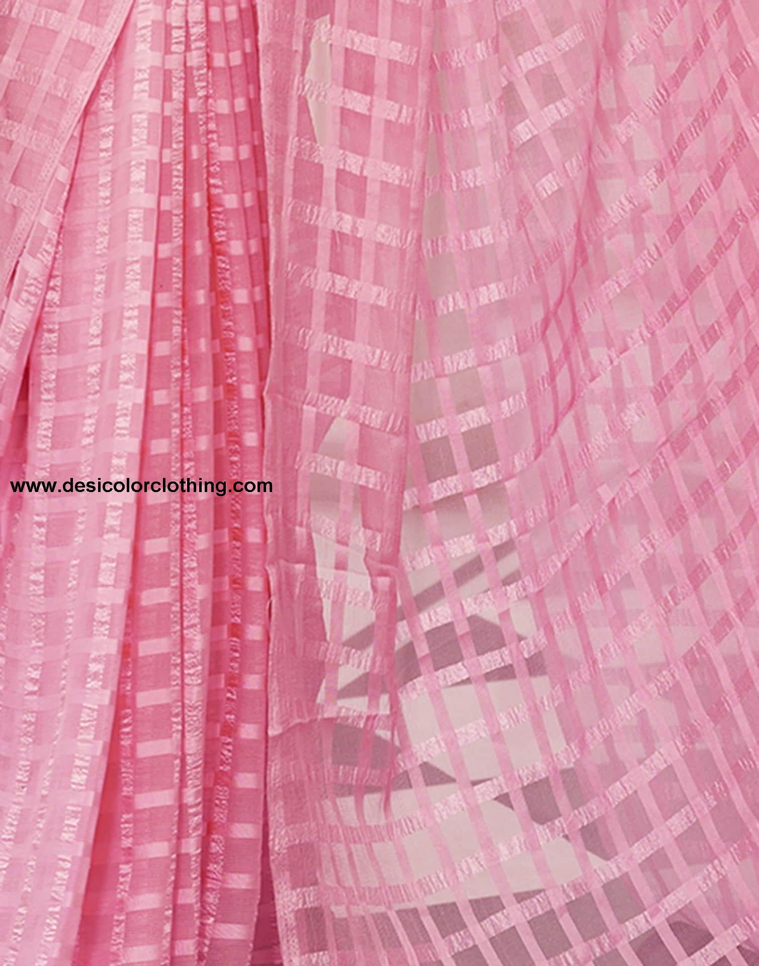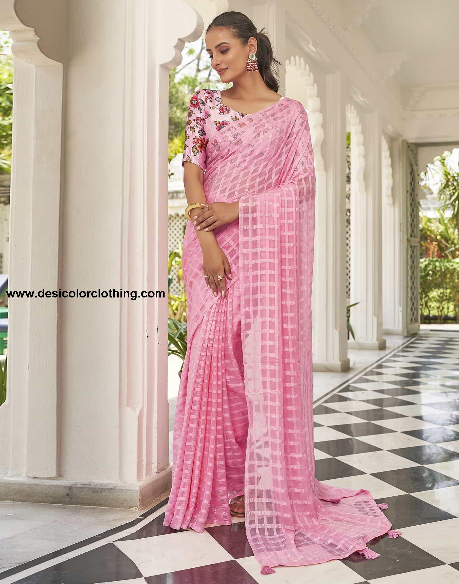 Blouse Color:Rose Pink, Multi Blouse Fabric:Satin Blouse Length:0.80 Mtr Blouse Work:Floral Printed Saree Color:Rose Pink Saree Fabric:Chiffon Saree Length:5.50 Mtr Saree Work:Plain, Woven Chex, Tassels Type:Checkered