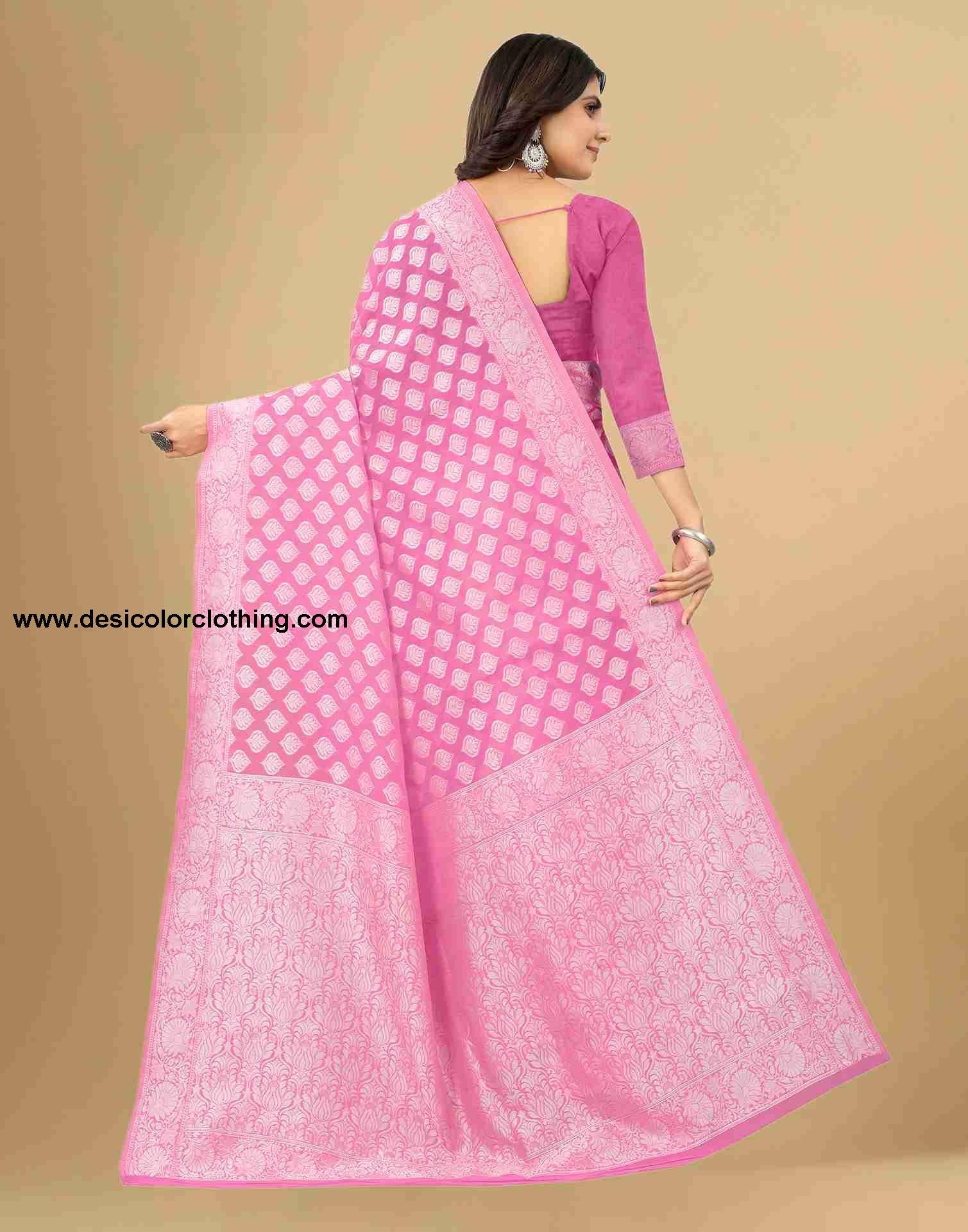 Blouse Color:Pink Blouse Fabric:Cotton Blend Blouse Length:0.80 Mtr Blouse Work:Plain, Woven Border Saree Color:Pink, Silver Saree Fabric:Cotton Blend Saree Length:5.50 Mtr Saree Work:Plain, Woven
