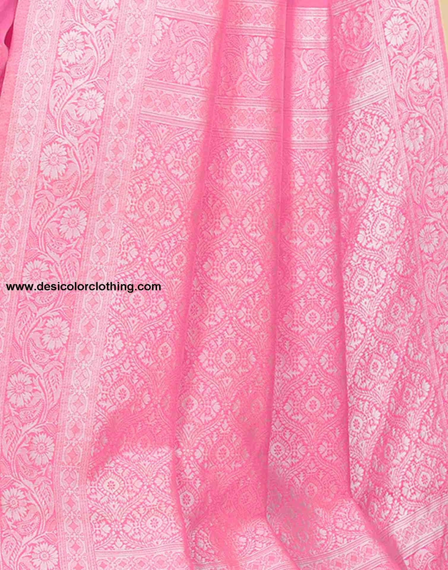 Blouse Color:Pink Blouse Fabric:Cotton Blend Blouse Length:0.80 Mtr Blouse Work:Plain, Woven Border Saree Color:Pink, Silver Saree Fabric:Cotton Blend Saree Length:5.50 Mtr Saree Work:Plain, Woven