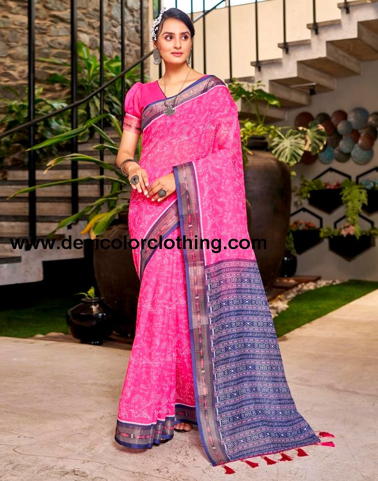Blouse Color:Pink Blouse Fabric:Linen Blouse Length:0.70 Mtr Blouse Work:Printed, Zari Border Saree Color:Pink, Violet Saree Fabric:Linen Saree Length:5.30 Mtr Saree Work:Printed, Zari Border, Tassels