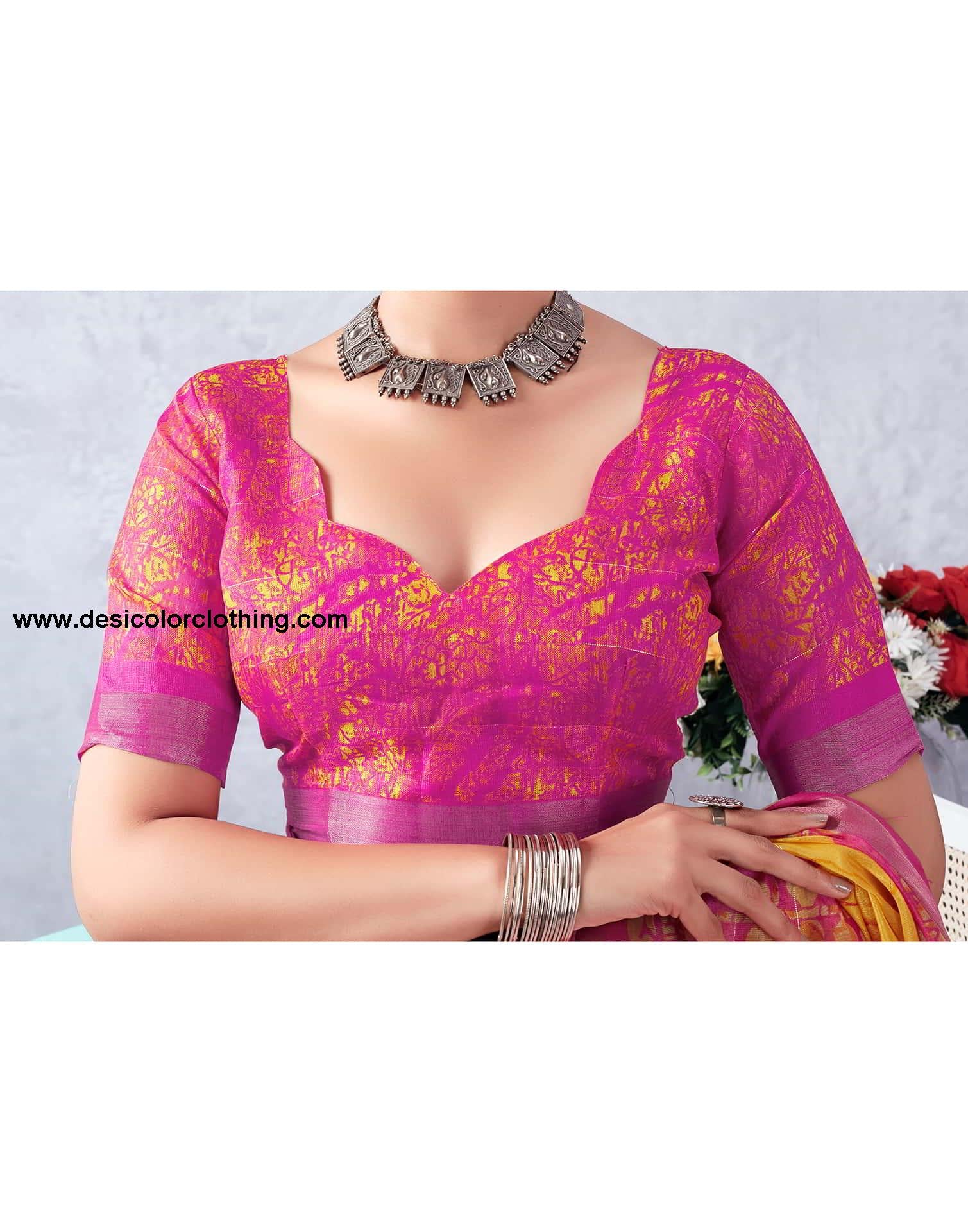 Blouse Color:Rani Pink, Turmeric Blouse Fabric:Cotton Blend Blouse Length:0.70 Mtr Blouse Work:Printed, Zari Stripe Saree Color:Rani Pink, Turmeric Saree Fabric:Cotton Blend Saree Length:5.30 Mtr Saree Work:Printed, Zari Stripe Type:Printed