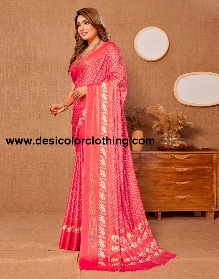 Blouse Color:Pink, Off White Blouse Fabric:Polyester Blouse Length:0.80 Mtr Blouse Work:Printed, Foil Print Saree Color:Pink Saree Fabric:Moss Saree Length:5.50 Mtr Saree Work:Printed, Foil Print