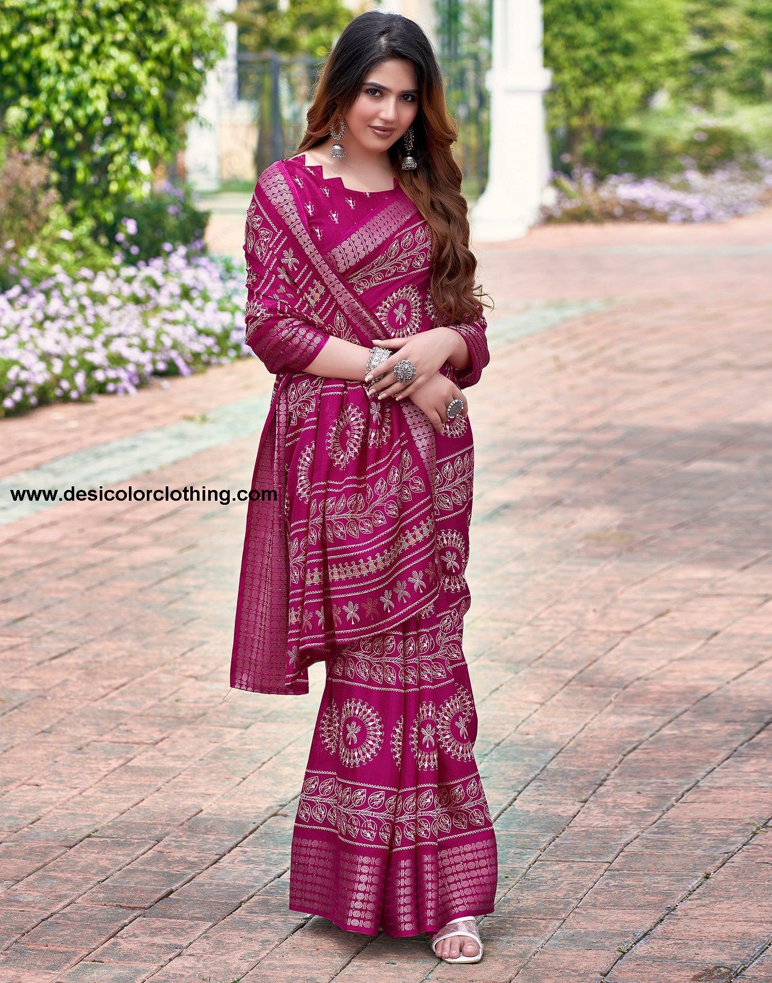 Blouse Color:Pink, White Blouse Fabric:Printed Blouse Length:0.70 Mtr Blouse Work:Varli Printed, Weaving And Sequence Border Saree Color:Pink, Multicoloured Saree Fabric:Dola Silk Saree Length:5.50 Mtr Saree Work:Printed