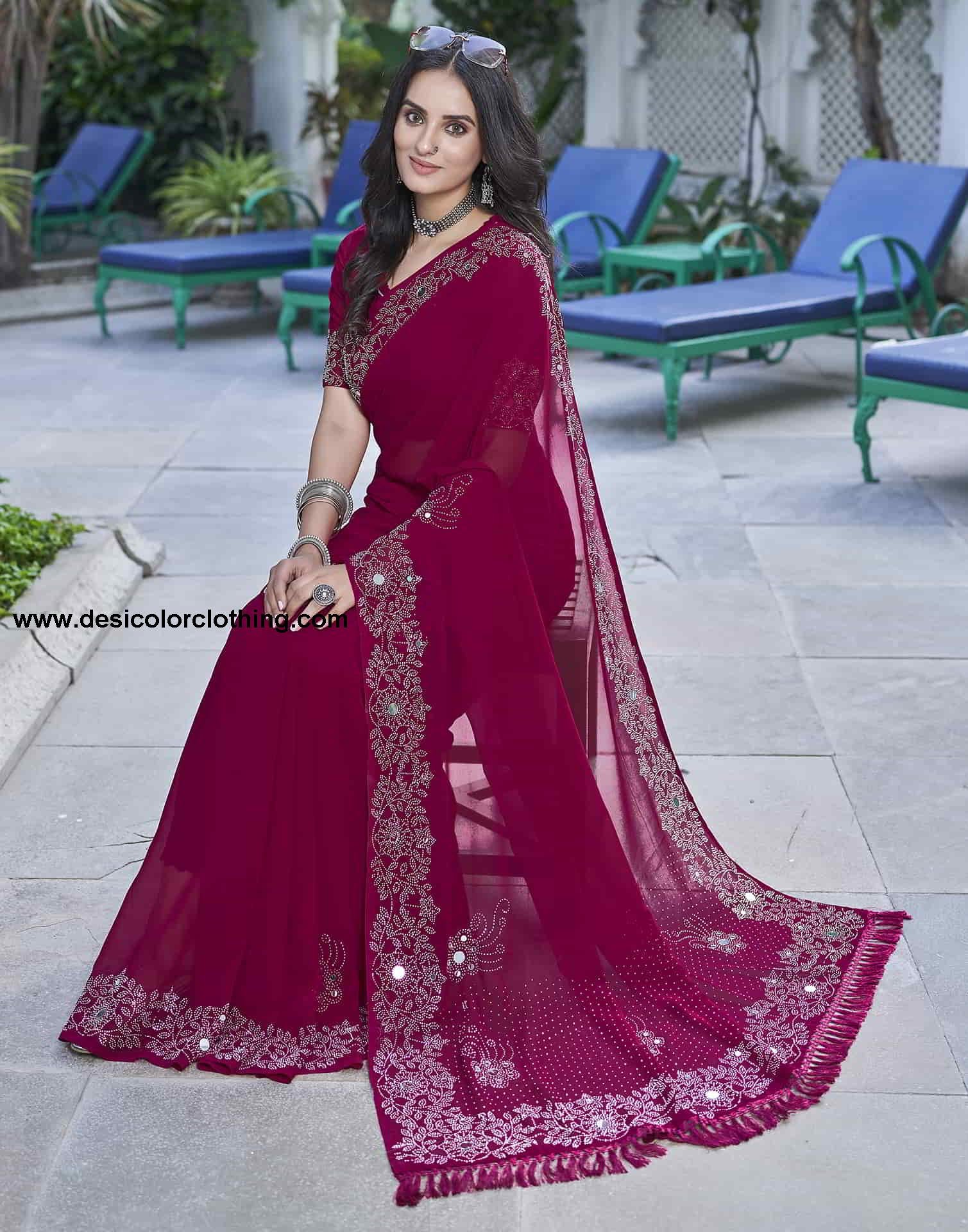 Blouse Color:Dark Pink Blouse Fabric:Georgette Blouse Length:0.80 Mtr Blouse Work:Plain, Stone Work Saree Color:Dark Pink, Silver Saree Fabric:Georgette Saree Length:5.50 Mtr Saree Work:Plain, Stone Work, Mirror Work, Tassels Type:Embellished