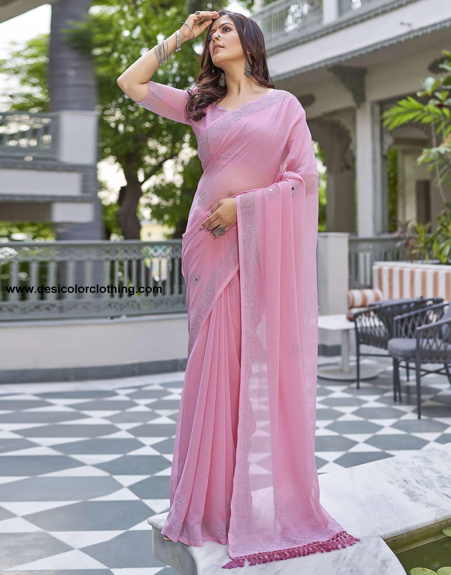 Pink Swarovski Georgette Stone Work Saree