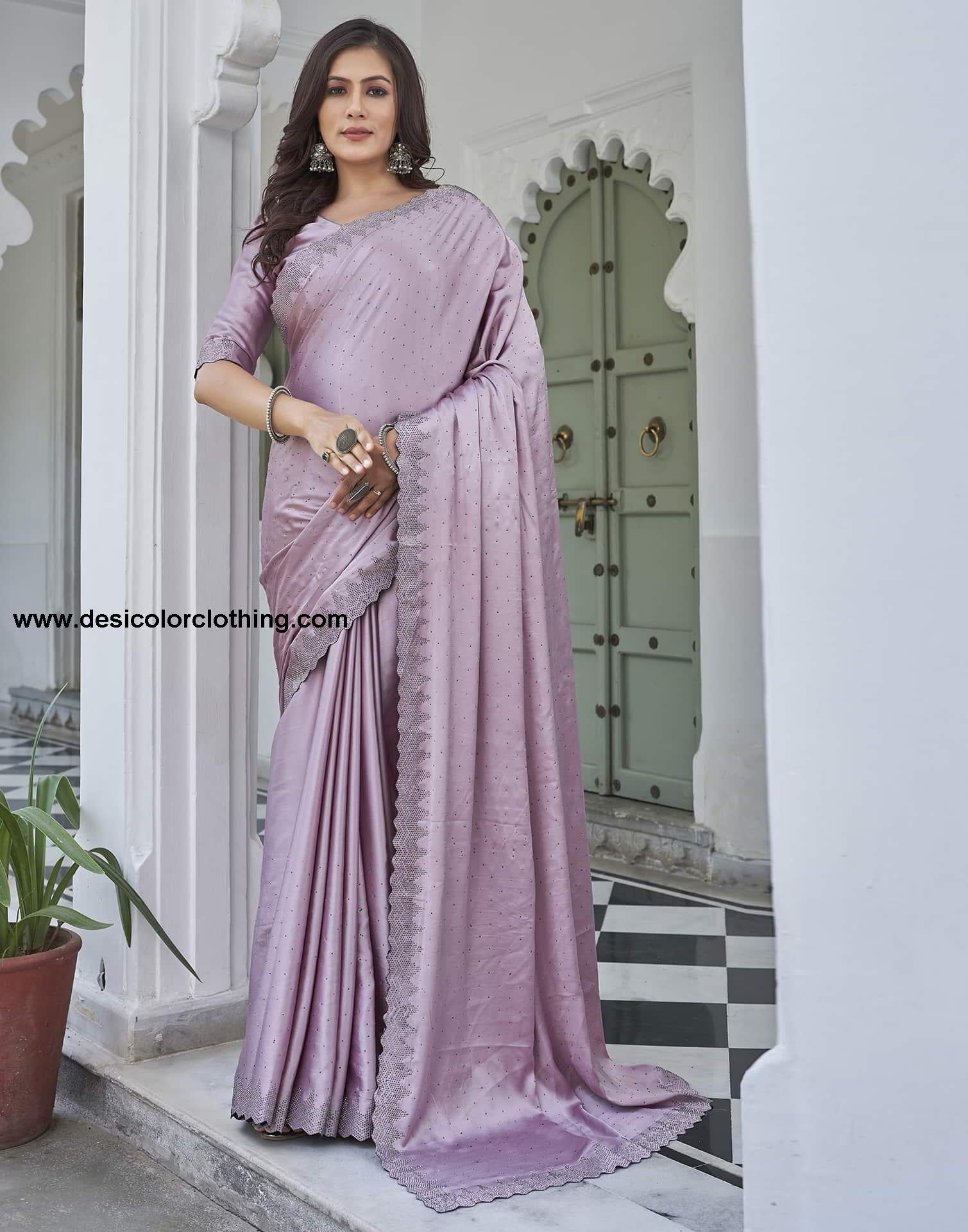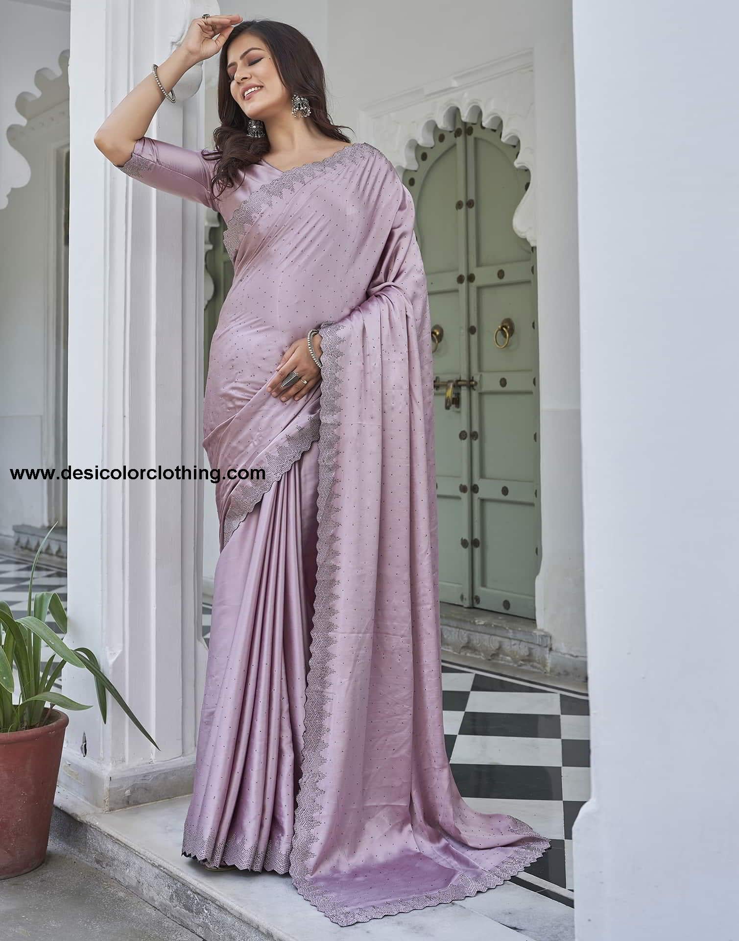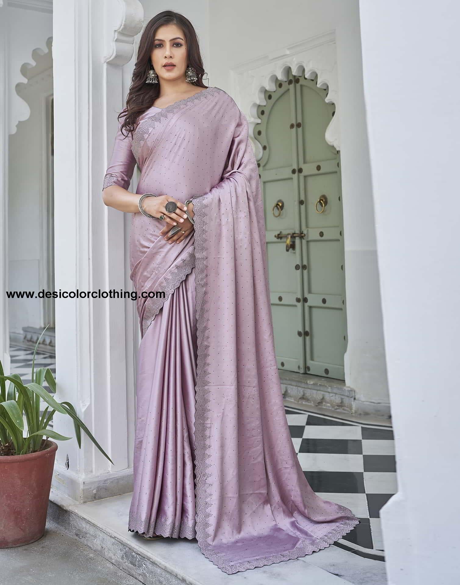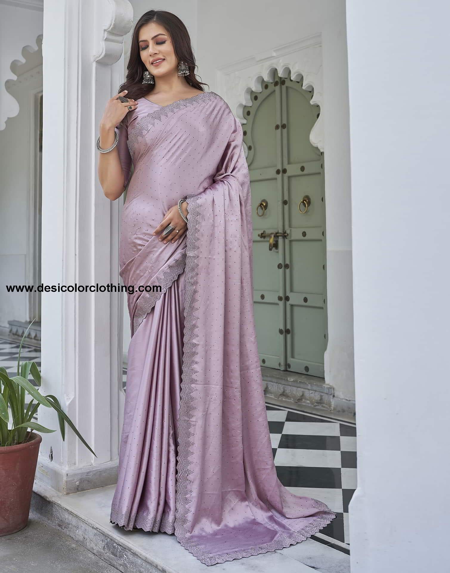 Pink Swarovski Satin Plain Saree