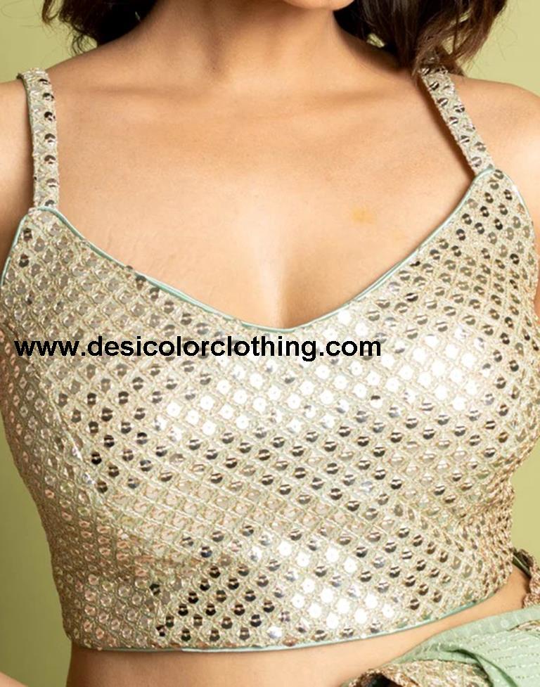 Blouse Color:Golden Blouse Fabric:Zari Brocade Blouse Length:0.80 Mtr Blouse Work:Sequence Embroidery Saree Color:Pista Green Saree Fabric:Georgette Saree Length:5.50 Mtr Saree Work:Plain