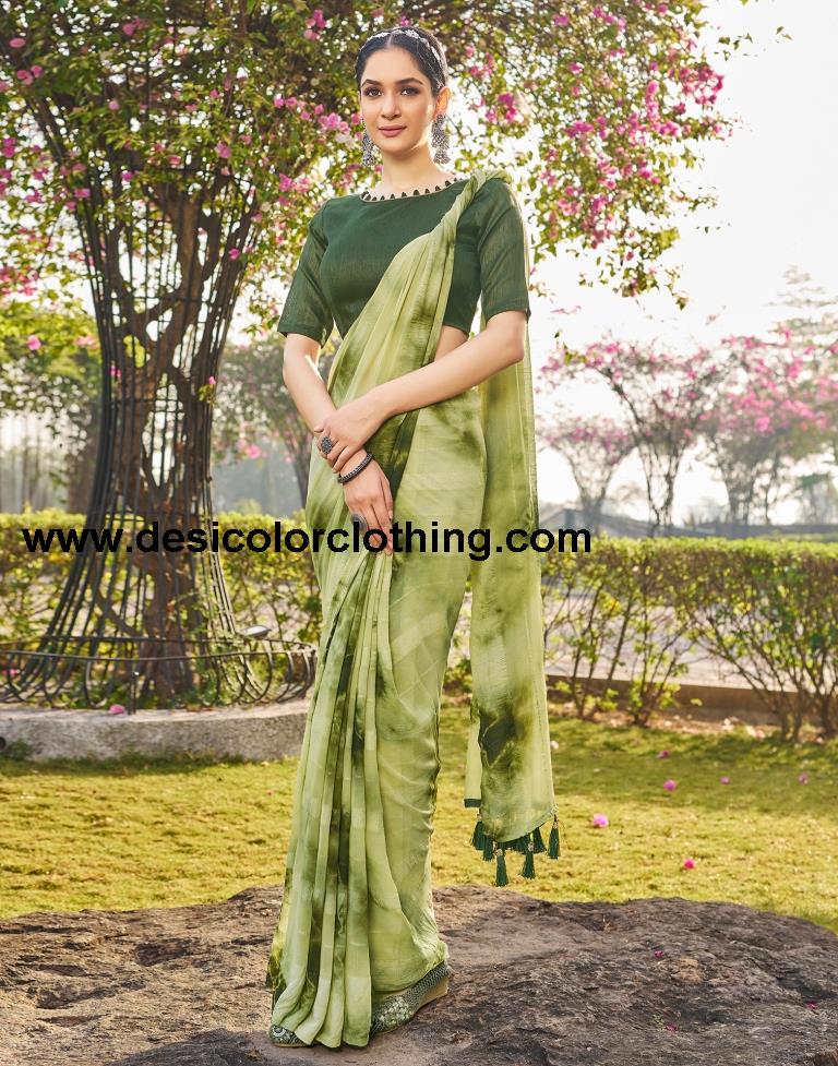 Blouse Color:Dark Olive Green Blouse Fabric:Benglori Silk ( Art Silk) Blouse Length:0.80 Mtr Blouse Work:Plain Saree Color:Pista Green, Olive Green Saree Fabric:Georgette Saree Length:6.00 Mtr Saree Work:Printed, Tassels