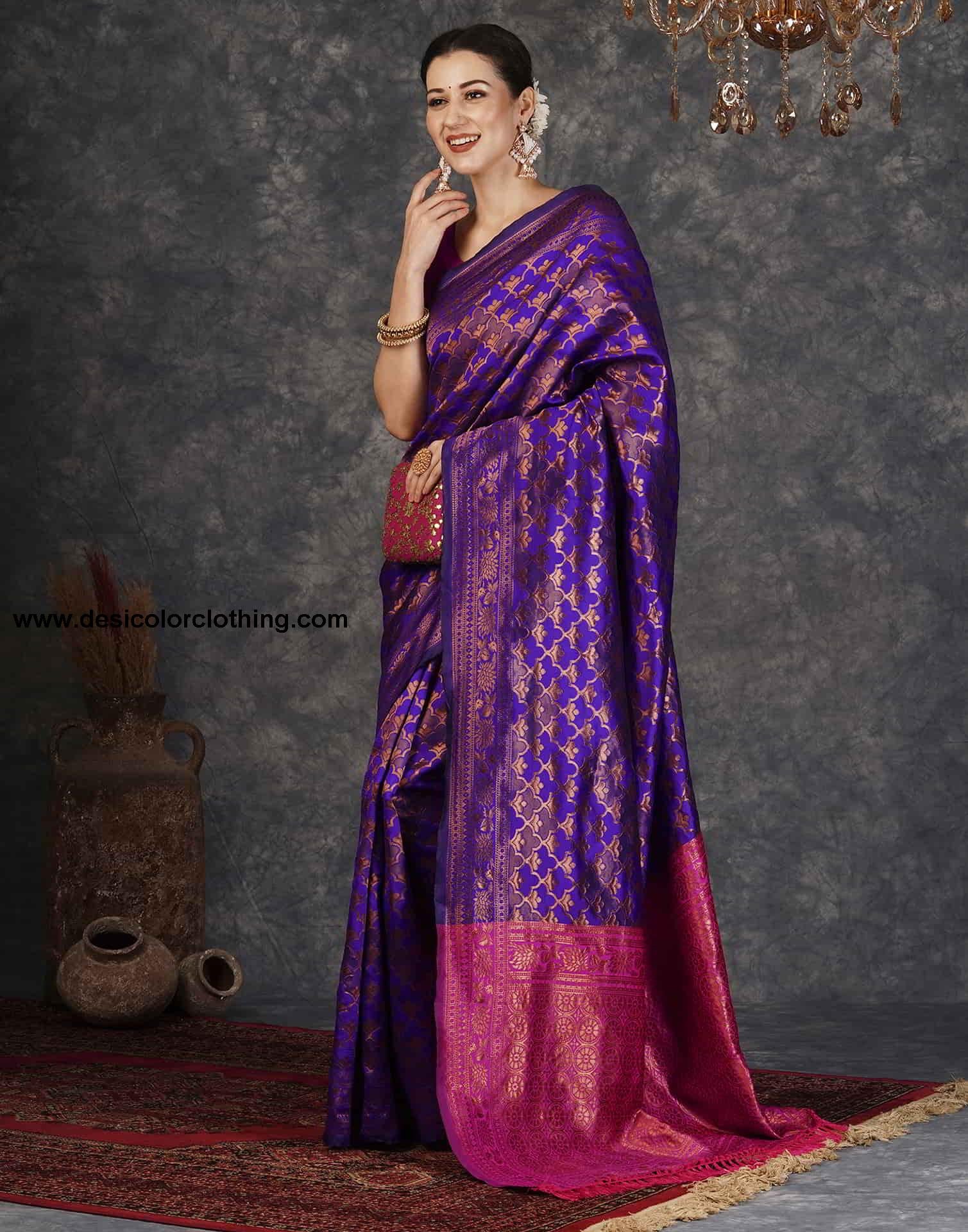Blouse Color:Magenta, Golden Blouse Fabric:Silk Blouse Length:0.80 Mtr Blouse Work:Plain, Woven Saree Color:Violet, Magenta, Golden Saree Fabric:Silk Saree Length:5.50 Mtr Saree Work:Woven, Tassels Type:Banarasi