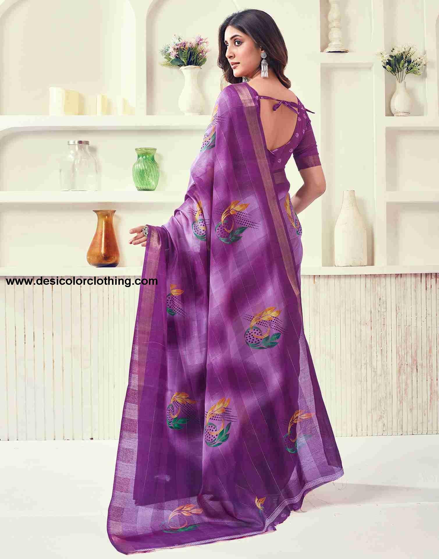 Blouse Color:Purple, Lavender Blouse Fabric:Cotton Blend Blouse Length:0.70 Mtr Blouse Work:Printed, Zari Stripe Saree Color:Purple, Lavender, Mullti Saree Fabric:Cotton Blend Saree Length:5.30 Mtr Saree Work:Floral Printed, Zari Stripe,