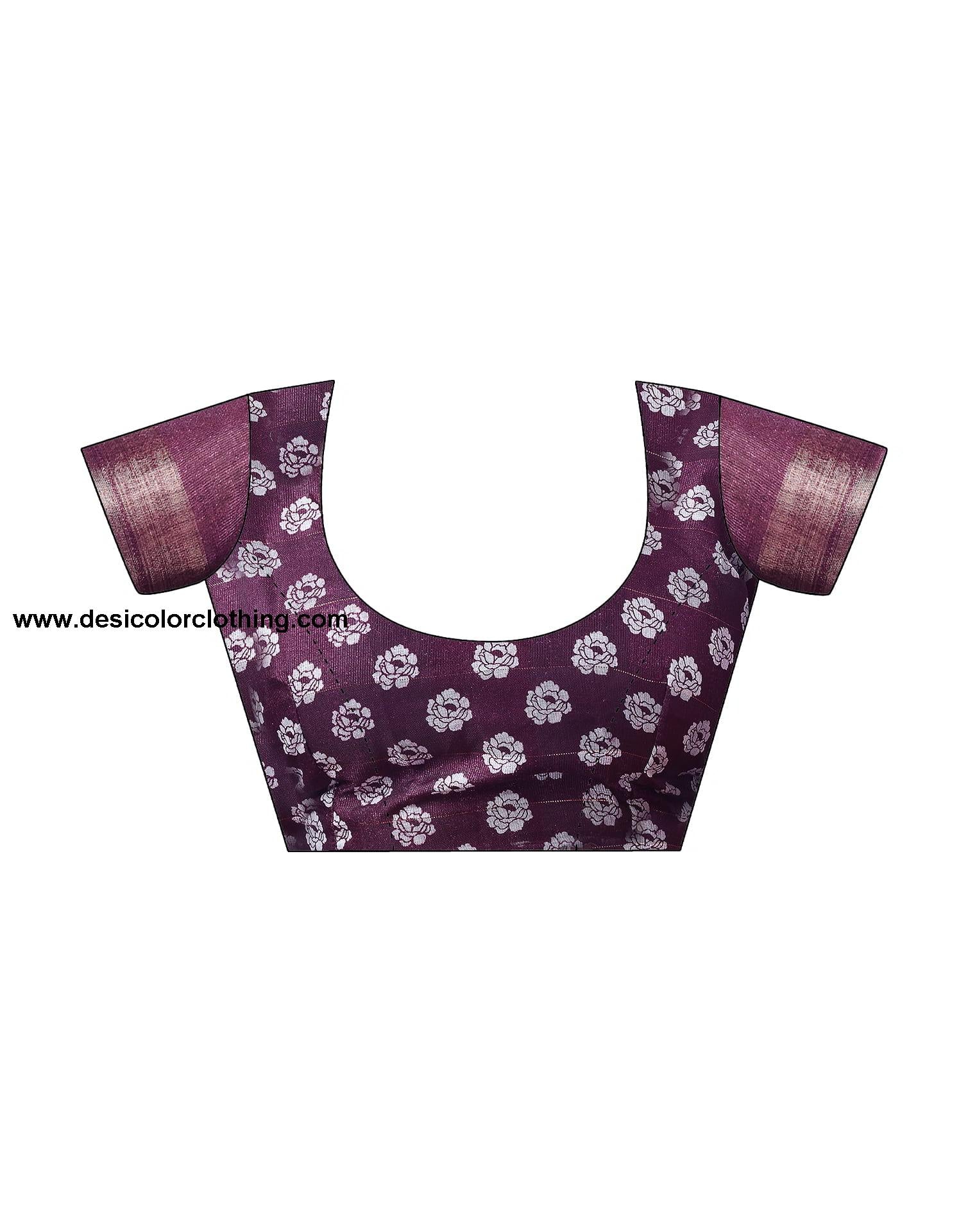 Blouse Color:Deep Purple, White Blouse Fabric:Cotton Blend Blouse Length:0.70 Mtr Blouse Work:Floral Printed, Zari Stripe Saree Color:Deep Purple, Teal Blue, Brown Saree Fabric:Cotton Blend Saree Length:5.30 Mtr Saree Work:Floral Printed, Zari Stripe Type:Printed