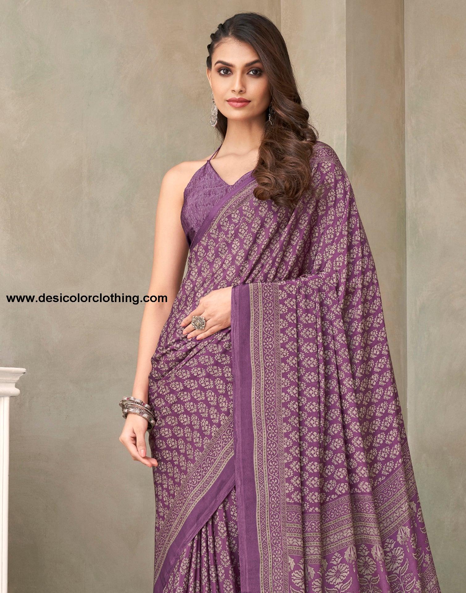 Blouse Color:Purple Blouse Fabric:Silk Crepe Blouse Length:0.75 Mtr Blouse Work:Printed Saree Color:Purple Saree Fabric:Silk Crepe Saree Length:5.50 Mtr Saree Work:Printed