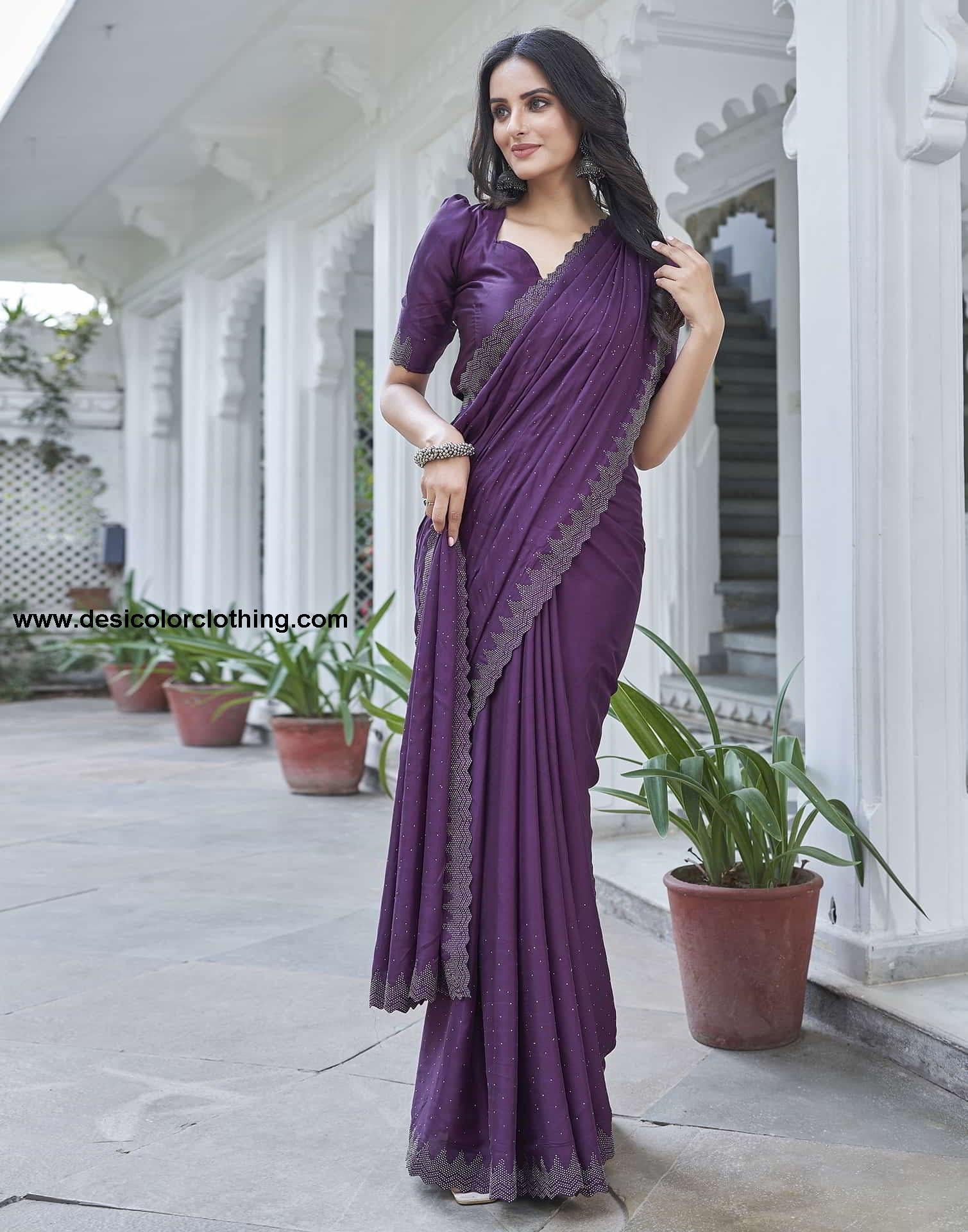 Blouse Color:Dark Purple Blouse Fabric:Satin Blouse Length:0.80 Mtr Blouse Work:Plain, Stone Work Border Saree Color:Dark Purple Saree Fabric:Satin Saree Length:6 Mtr Saree Work:Plain, Hot Fixing Border Type:Embellished