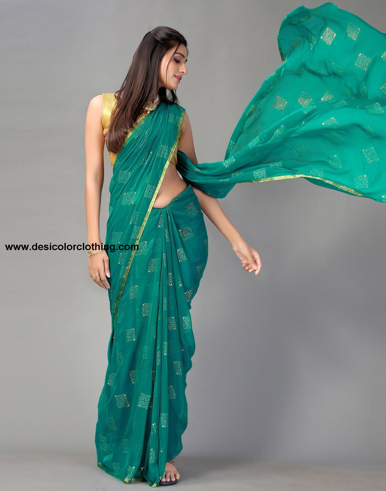 Blouse Color:Beige, Golden Blouse Fabric:Brocade Blouse Length:0.70 Mtr Blouse Work:Jacquard Saree Color:Rama Green Saree Fabric:Chiffon Saree Length:5.40 Mtr Saree Work:Dyed, Mukaish Work, Border Jari Stripes