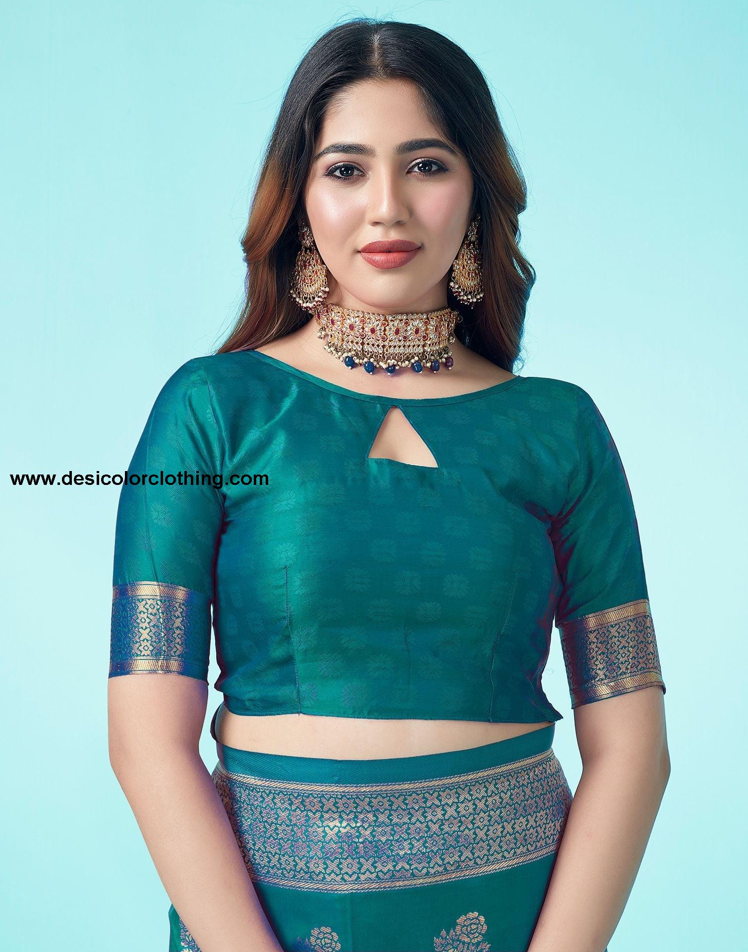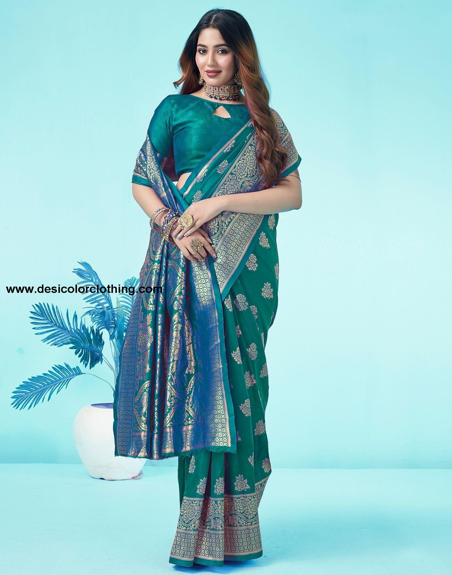 Blouse Color:Rama Green Blouse Fabric:Art Silk Blouse Length:0.80 Mtr Blouse Work:Self Woven, Jacquard Border Saree Color:Rama Green, Gold Saree Fabric:Art Silk Saree Length:5.30 Mtr Saree Work:Banarasi Jacquard