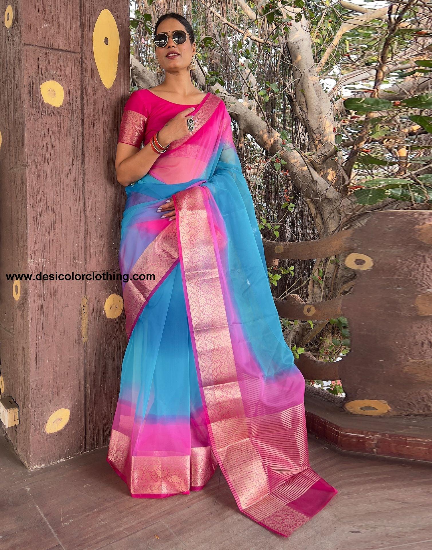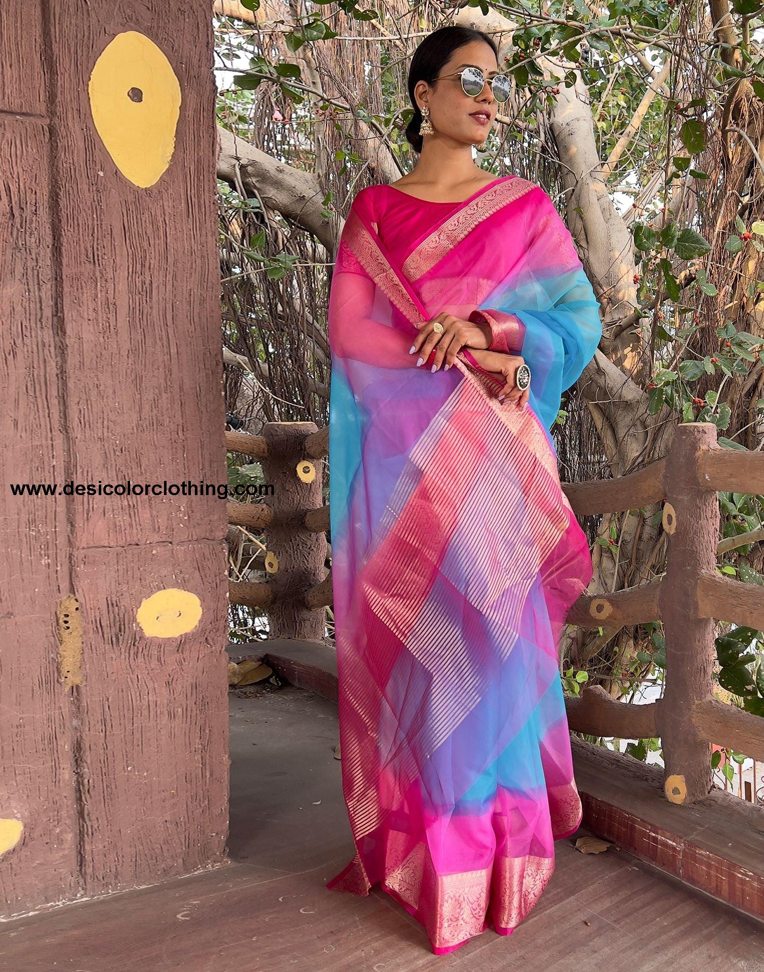 Blouse Color:Rani Pink Blouse Fabric:Organza Blouse Length:0.90 Mtr Blouse Work:Plain, Jacquard Border Saree Color:Rani Pink, Blue, Dark Blue Saree Fabric:Organza Saree Length:5.50 Mtr Saree Work:Dyed, Jacquard Border