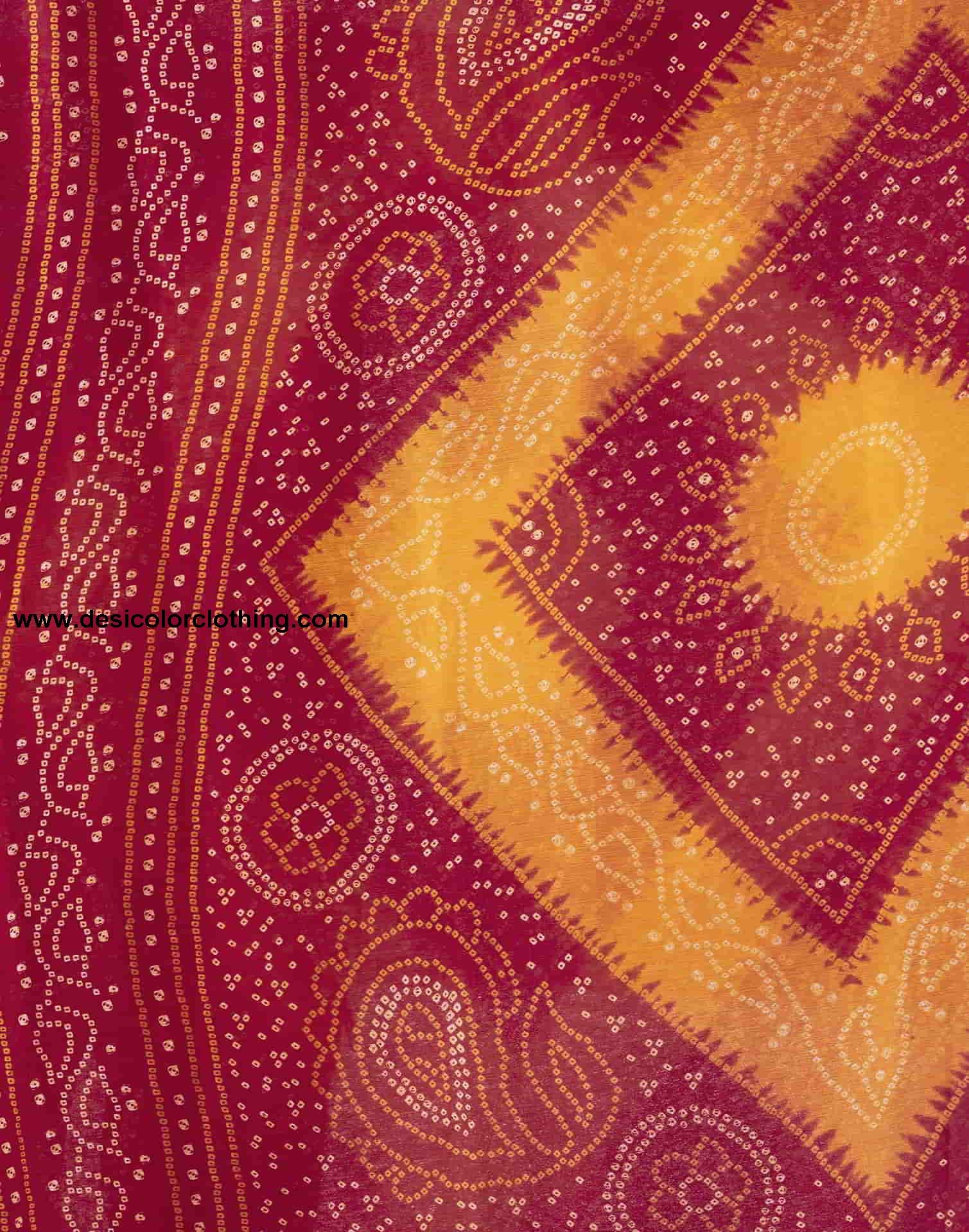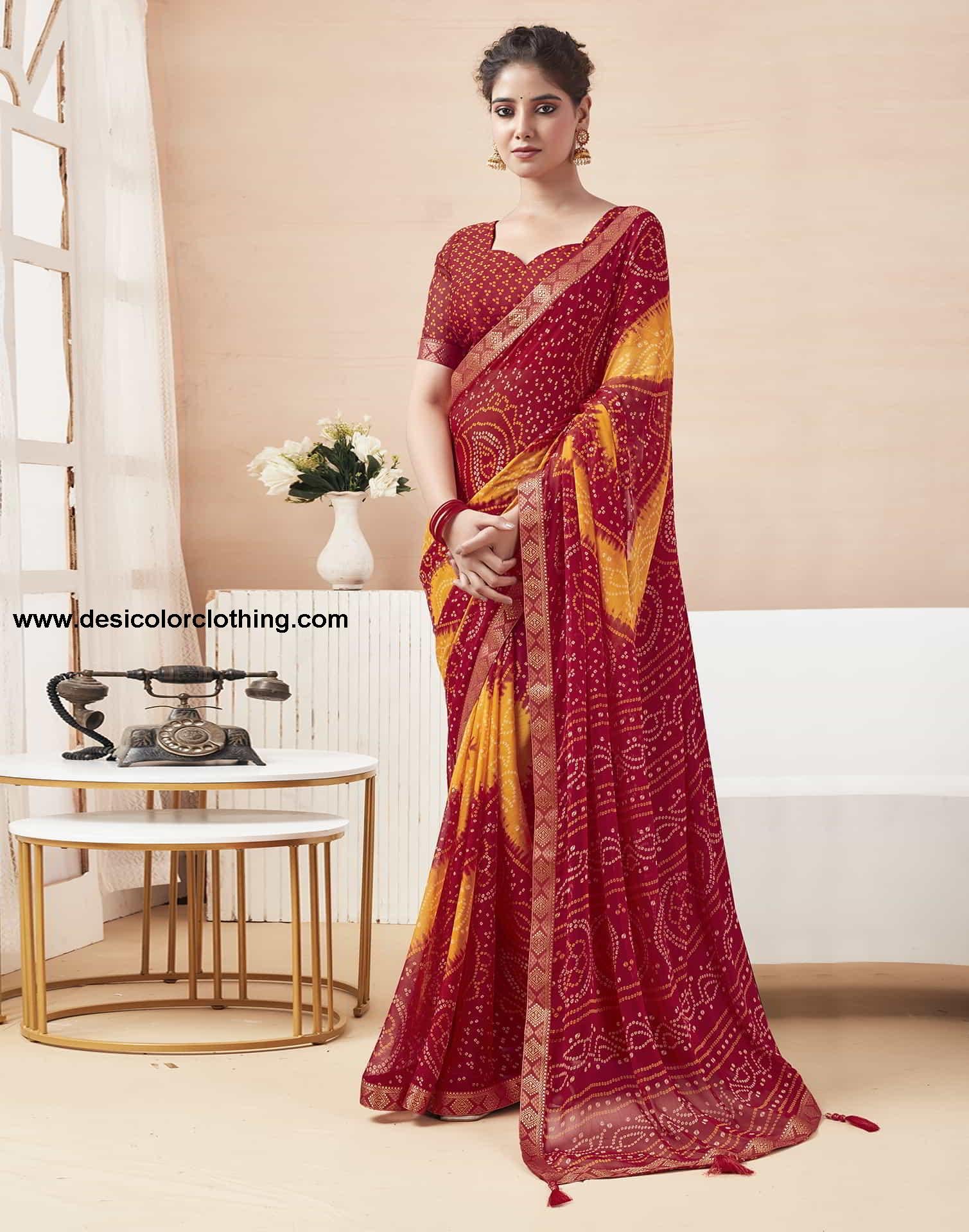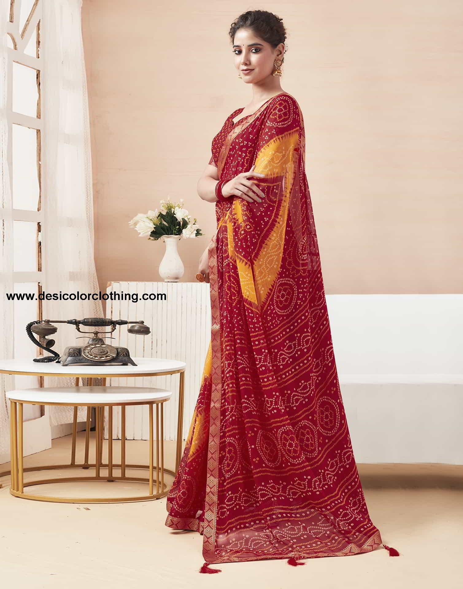 Blouse Color:Red, Turmeric Blouse Fabric:Chiffon Blouse Length:0.80 Mtr Blouse Work:Bandhani Printed Saree Color:Red, Turmeric, Cream Saree Fabric:Chiffon Saree Length:5.30 Mtr Saree Work:Bandhani Printed, Lace, Tassels Type:Bandhani
