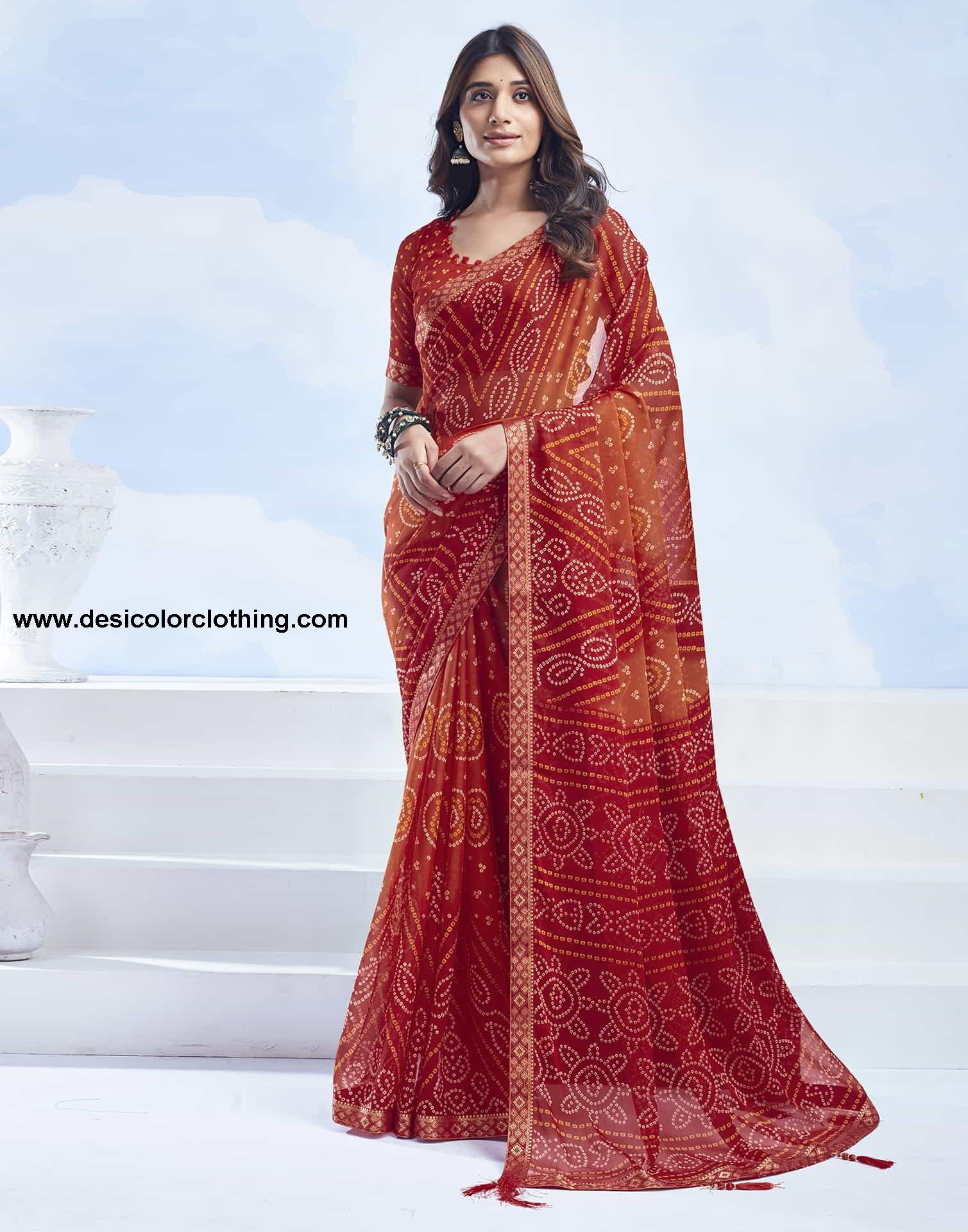 Blouse Color:Red, Yellow Blouse Fabric:Chiffon Blouse Length:0.80 Mtr Blouse Work:Bandhani Printed, Lace Saree Color:Red, Orange, White, Yellow Saree Fabric:Chiffon Saree Length:5.30 Mtr Saree Work:Bandhani Printed, Lace, Tassels Type:Bandhani