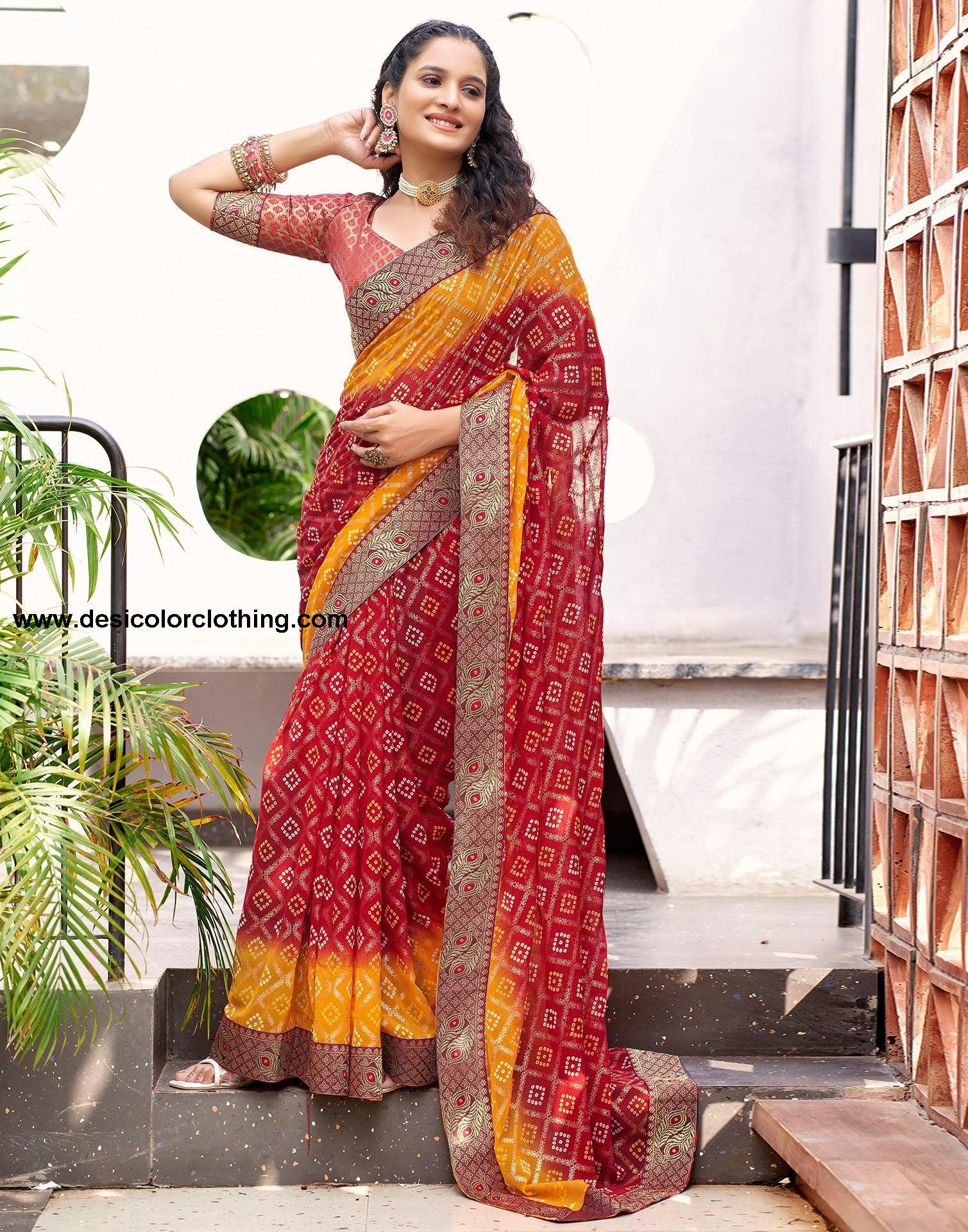 Blouse Color:Red, Golden Blouse Fabric:Art Silk Blouse Length:0.70 Mtr Blouse Work:Plain, Lace Saree Color:Red, Yellow Saree Fabric:Georgette Saree Length:5.30 Mtr Saree Work:Bandhani Print, Foil Print, Lace