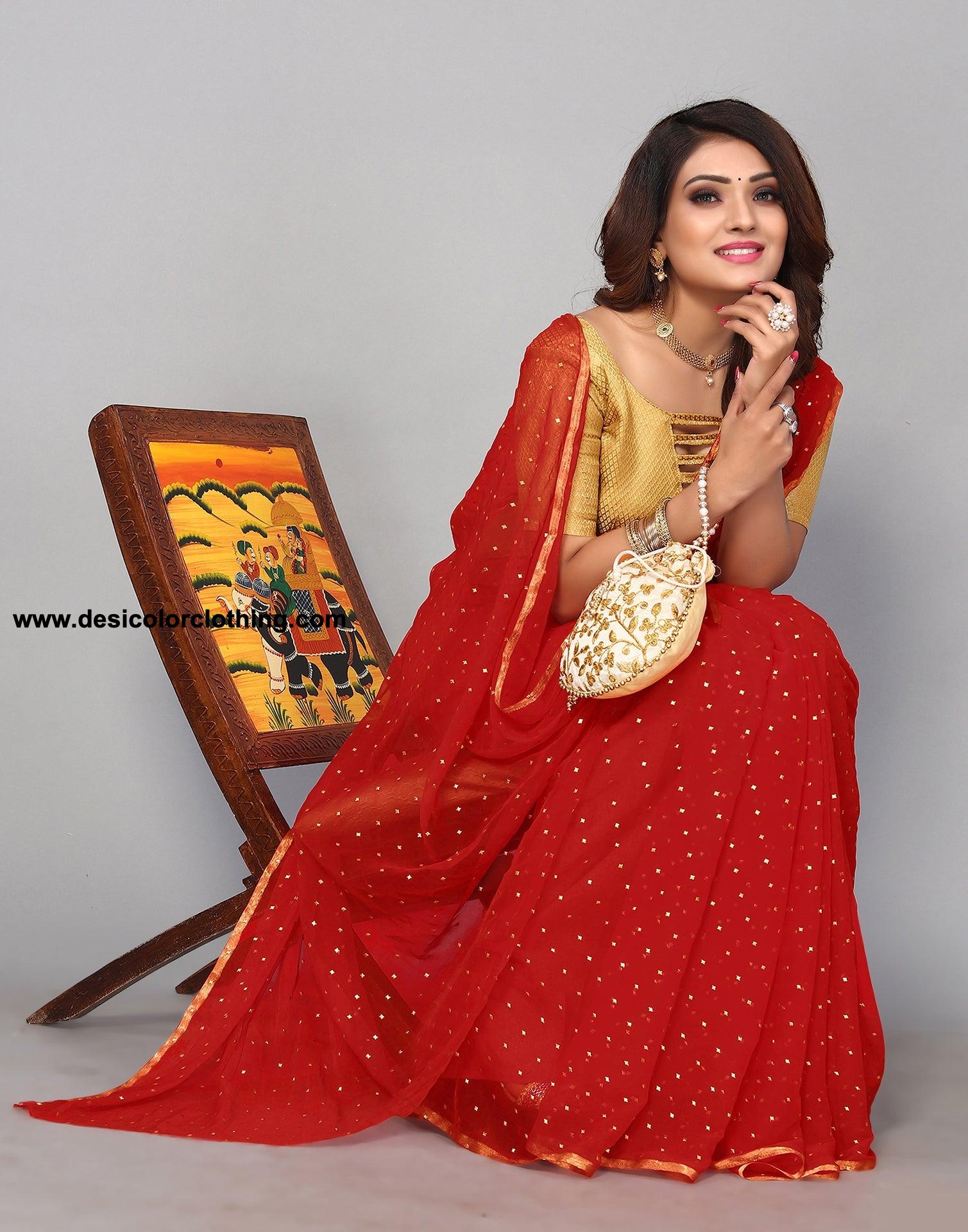 Blouse Color:Golden Blouse Fabric:Brocade Blouse Length:0.70 Mtr Blouse Work:Jacquard Saree Color:Red Saree Fabric:Chiffon Saree Length:5.30 Mtr Saree Work:Jari Border, Mukaish Work, Dyed Type:Printed