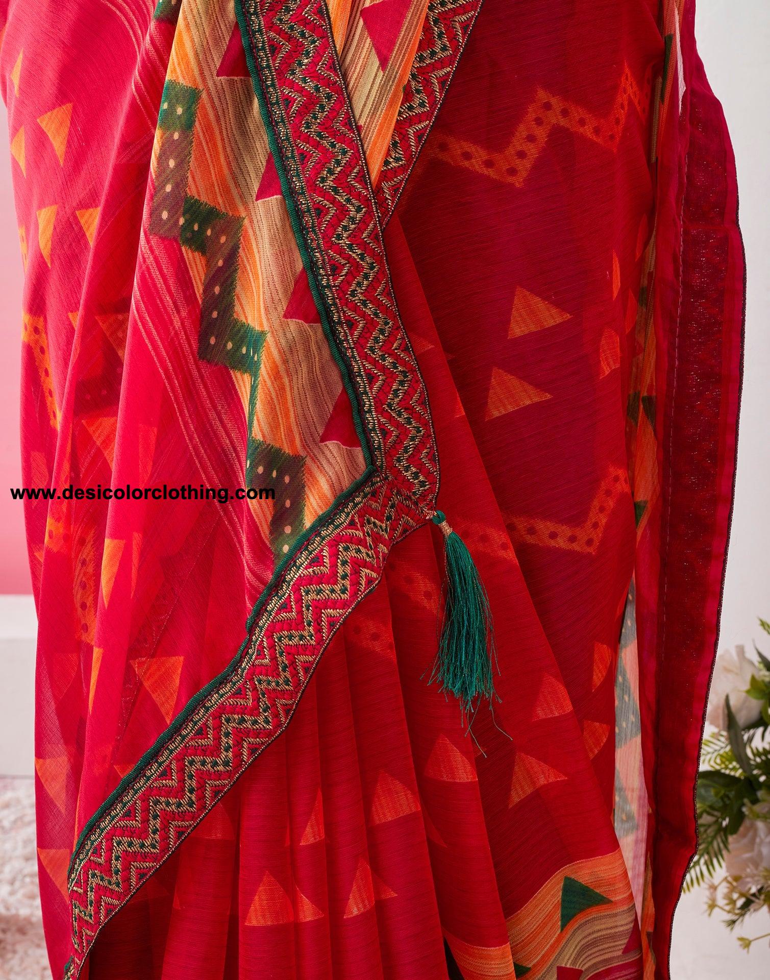 Blouse Color:Dark Green Blouse Fabric:Plain Blouse Length:0.80 Mtr Blouse Work:Plain, Lace Saree Color:Red Saree Fabric:Chiffon Saree Length:5.50 Mtr Saree Work:Printed