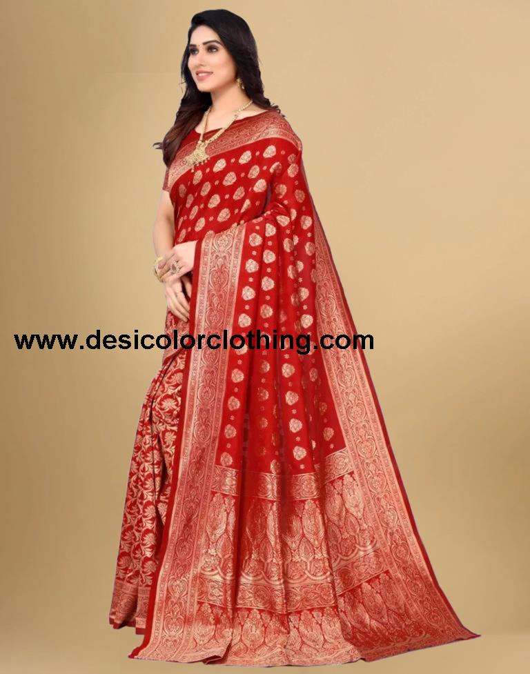 Blouse Color:Red Blouse Fabric:Polysilk Blouse Length:0.80 Mtr Blouse Work:Jacquard Border, Self Woven Saree Color:Red, Gold Saree Fabric:Polysilk Saree Work:Jacquard Type:Banarasi