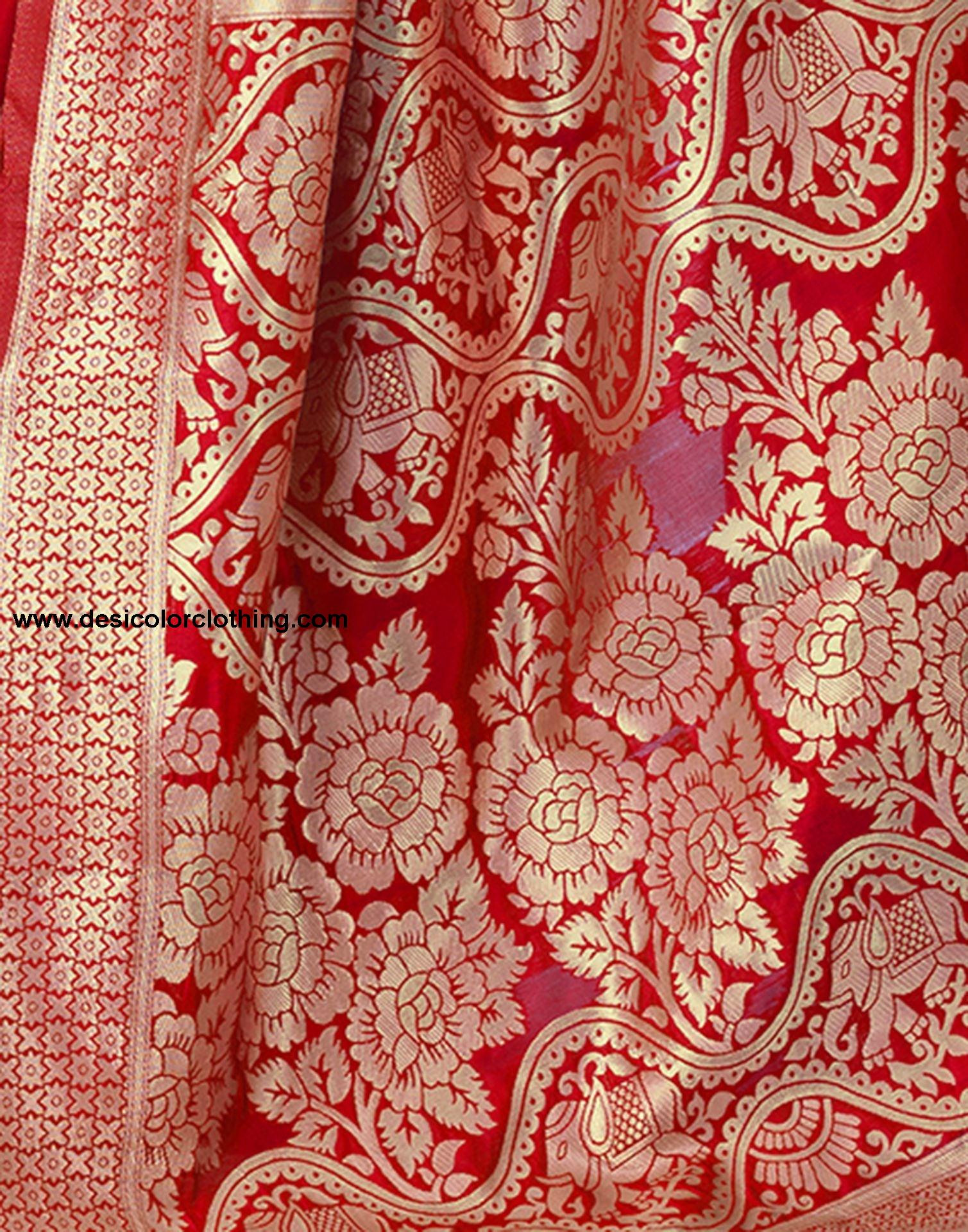 Blouse Color:Red Blouse Fabric:Art Silk Blouse Length:0.80 Mtr Blouse Work:Self Woven, Jacquard Border Saree Color:Red, Gold Saree Fabric:Art Silk Saree Length:5.30 Mtr Saree Work:Banarasi Jacquard
