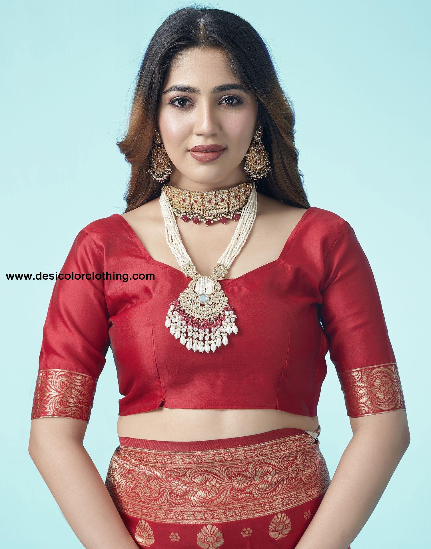 Blouse Color:Red Blouse Fabric:Poly Silk Blouse Length:0.80 Mtr Blouse Work:Jacquard Border, Plain Saree Color:Red, Gold Saree Fabric:Art Silk Saree Length:5.30 Mtr Saree Work:Jacquard (Banarasi)