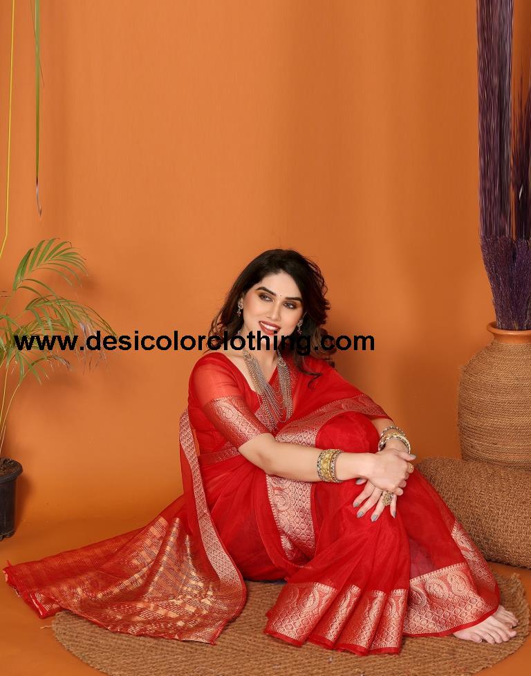 Blouse Color:Red Blouse Fabric:Organza Blouse Length:0.80 Mtr Blouse Work:Plain, Jacquard Border Saree Color:Red Saree Fabric:Organza Saree Length:5.50 Mtr Saree Work:Plain