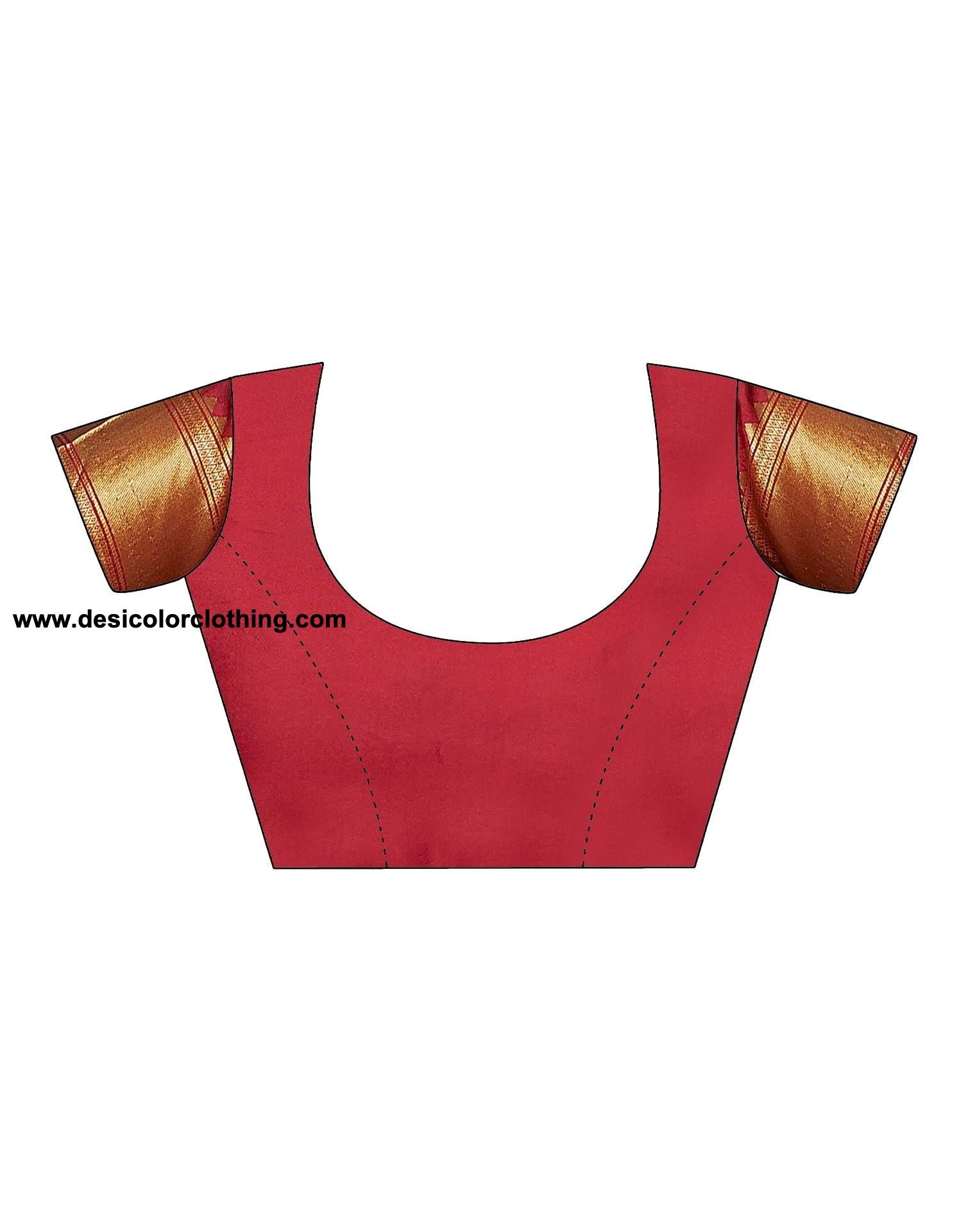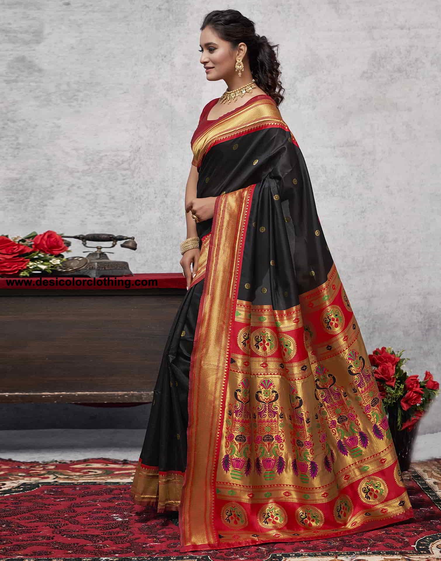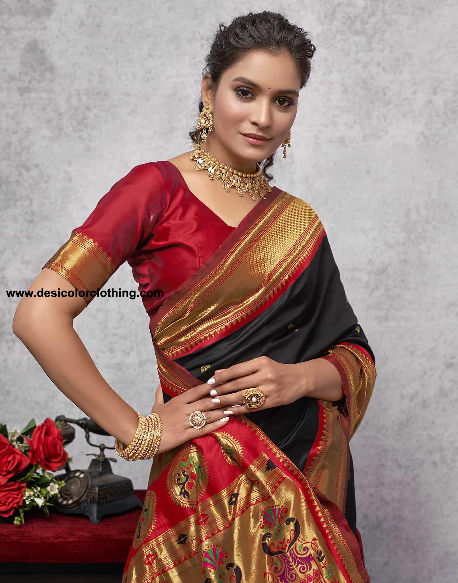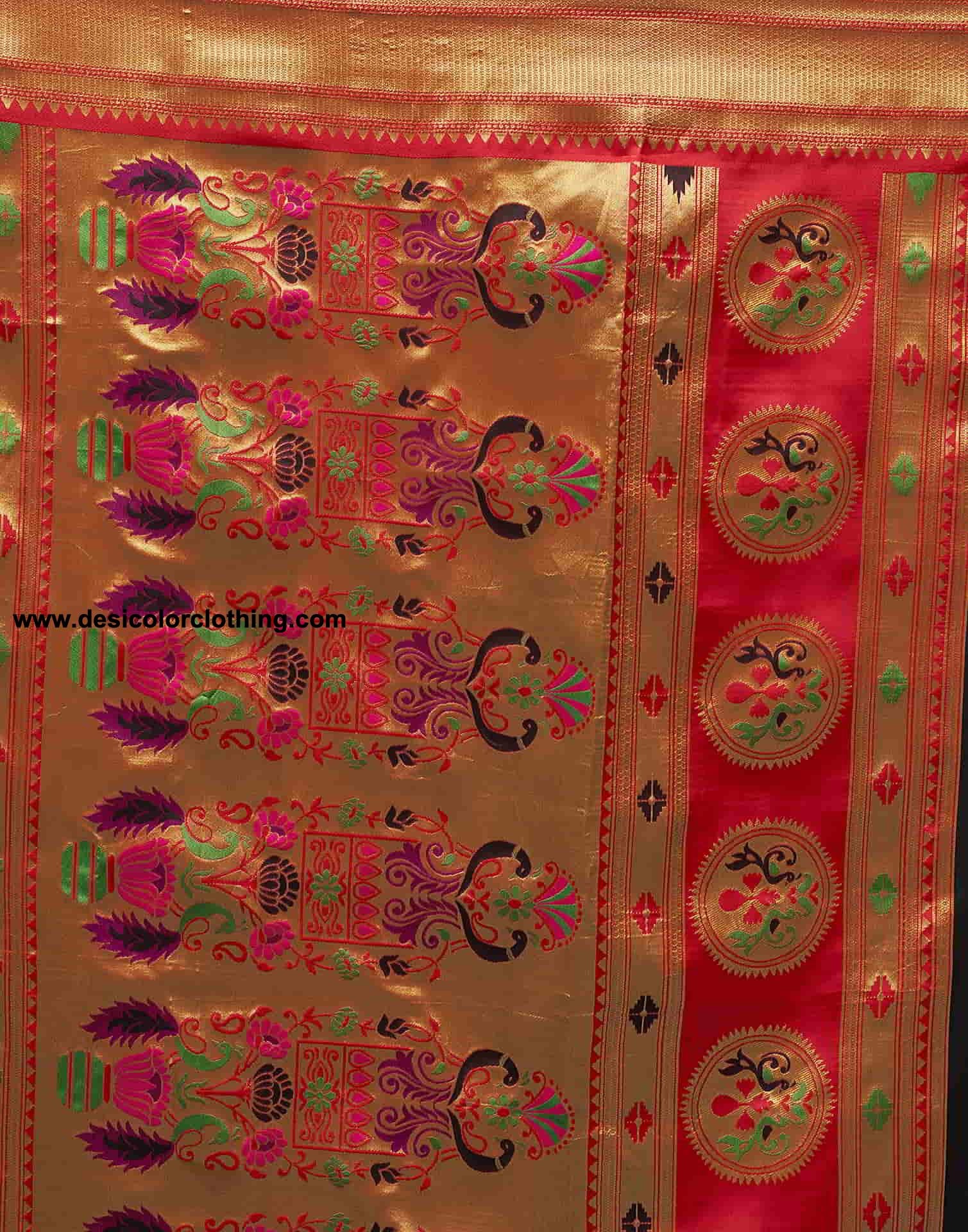 Blouse Color:Red Blouse Fabric:Silk Blouse Length:0.70 Mtr Blouse Work:Plain, Woven Border Saree Color:Red, Golden, Multi Saree Fabric:Silk Saree Length:5.30 Mtr Saree Work:Plain, Woven ( Paithani) Type:Paithani