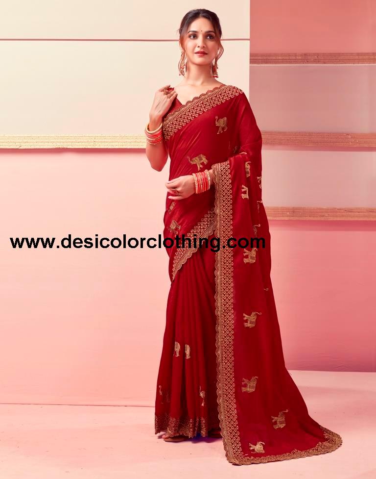Blouse Color:Red Blouse Fabric:Dola Silk Blouse Length:0.80 Mtr Blouse Work:Plain, Embroidery Lace Saree Color:Red, Golden Saree Fabric:Vichitra Silk Saree Length:5.50 Mtr Saree Work:Plain, Embroidery, Scalped Border