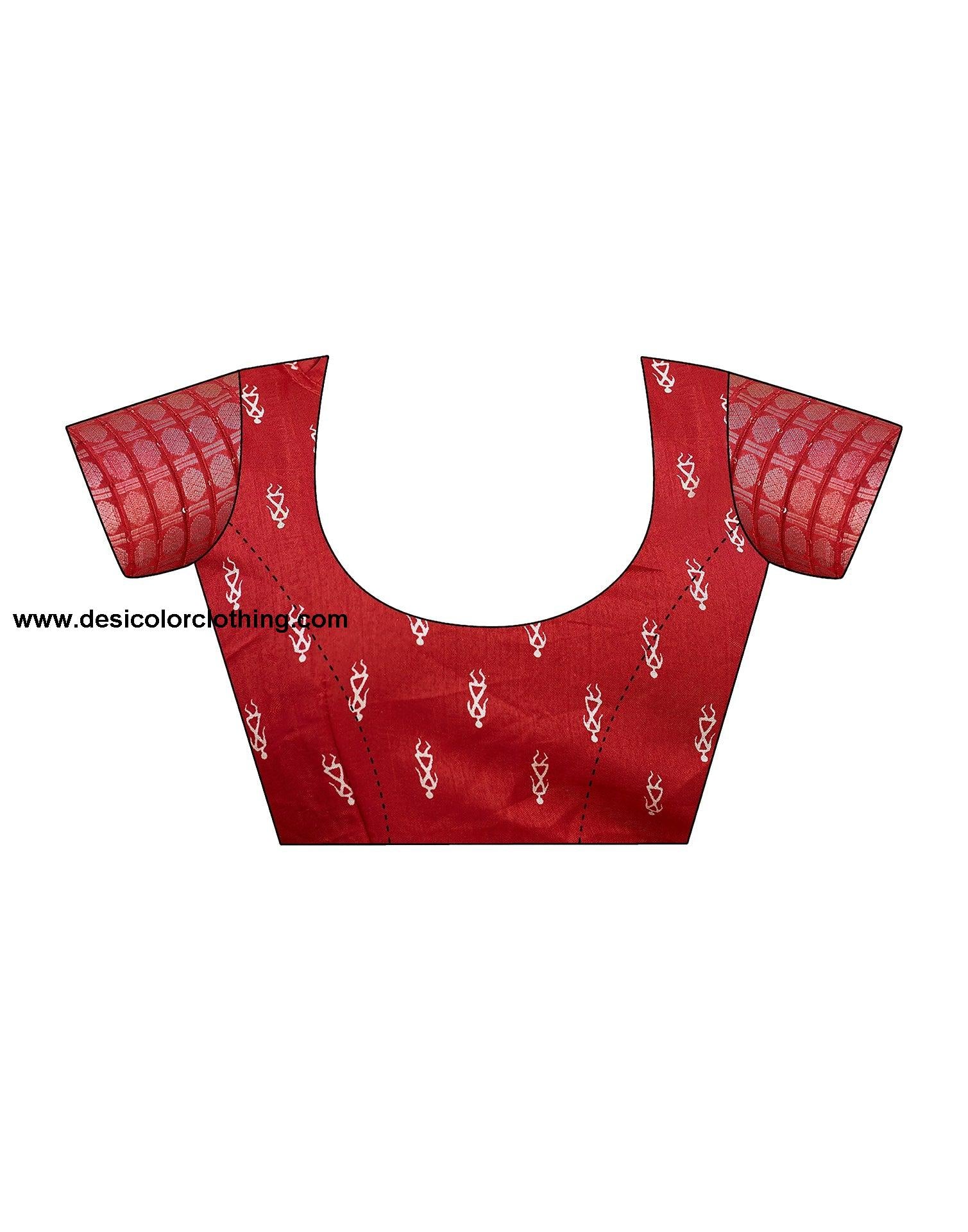 Blouse Color:Red, Off White Blouse Fabric:Printed Blouse Length:0.70 Mtr Blouse Work:Varli Printed, Weaving And Sequence Border Saree Color:Red, Multicoloured Saree Fabric:Dola Silk Saree Length:5.50 Mtr Saree Work:Printed