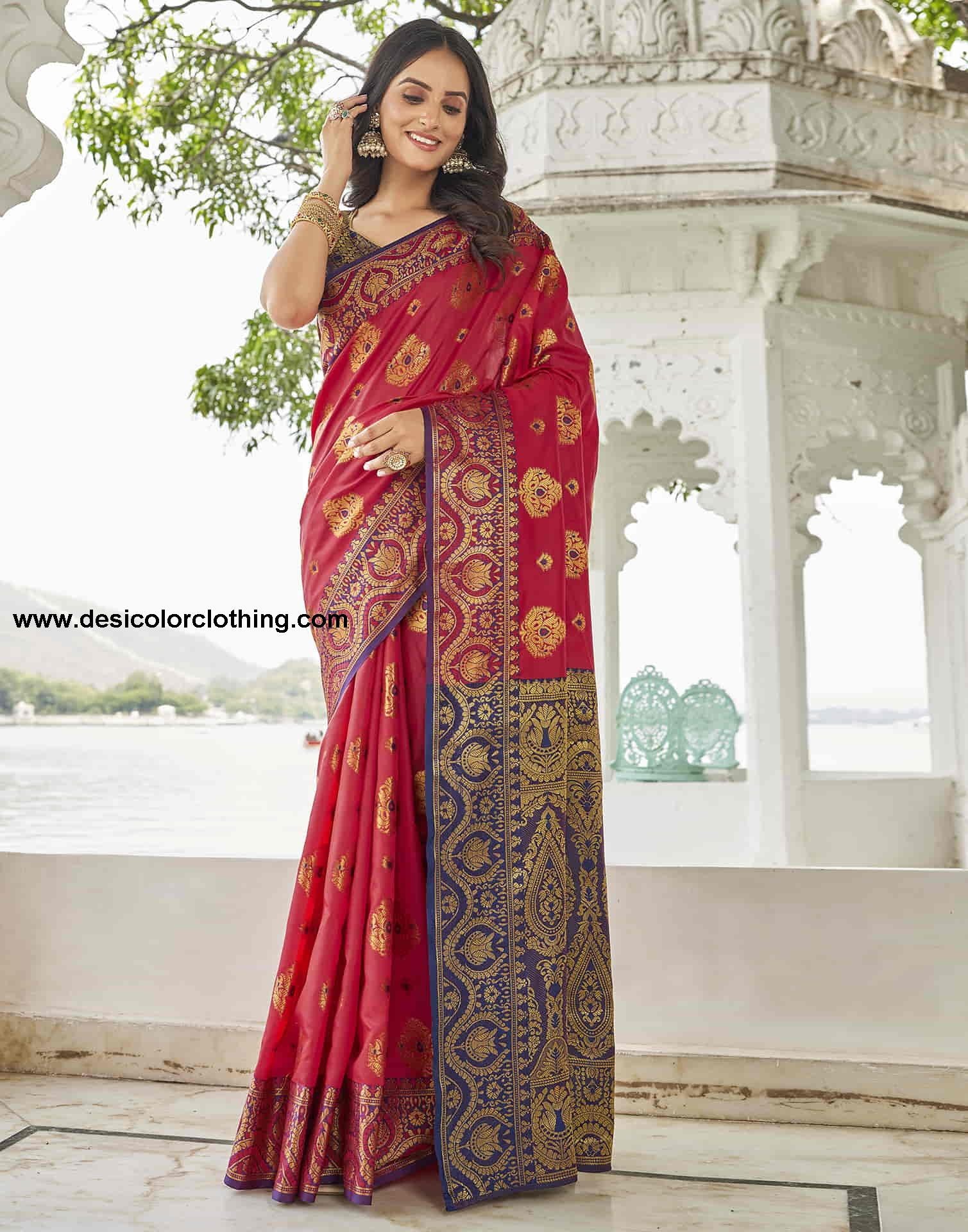 Saree Color:Red, Navy Blue, Golden Type:Banarasi
