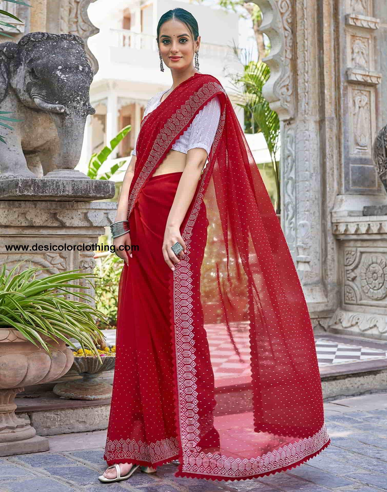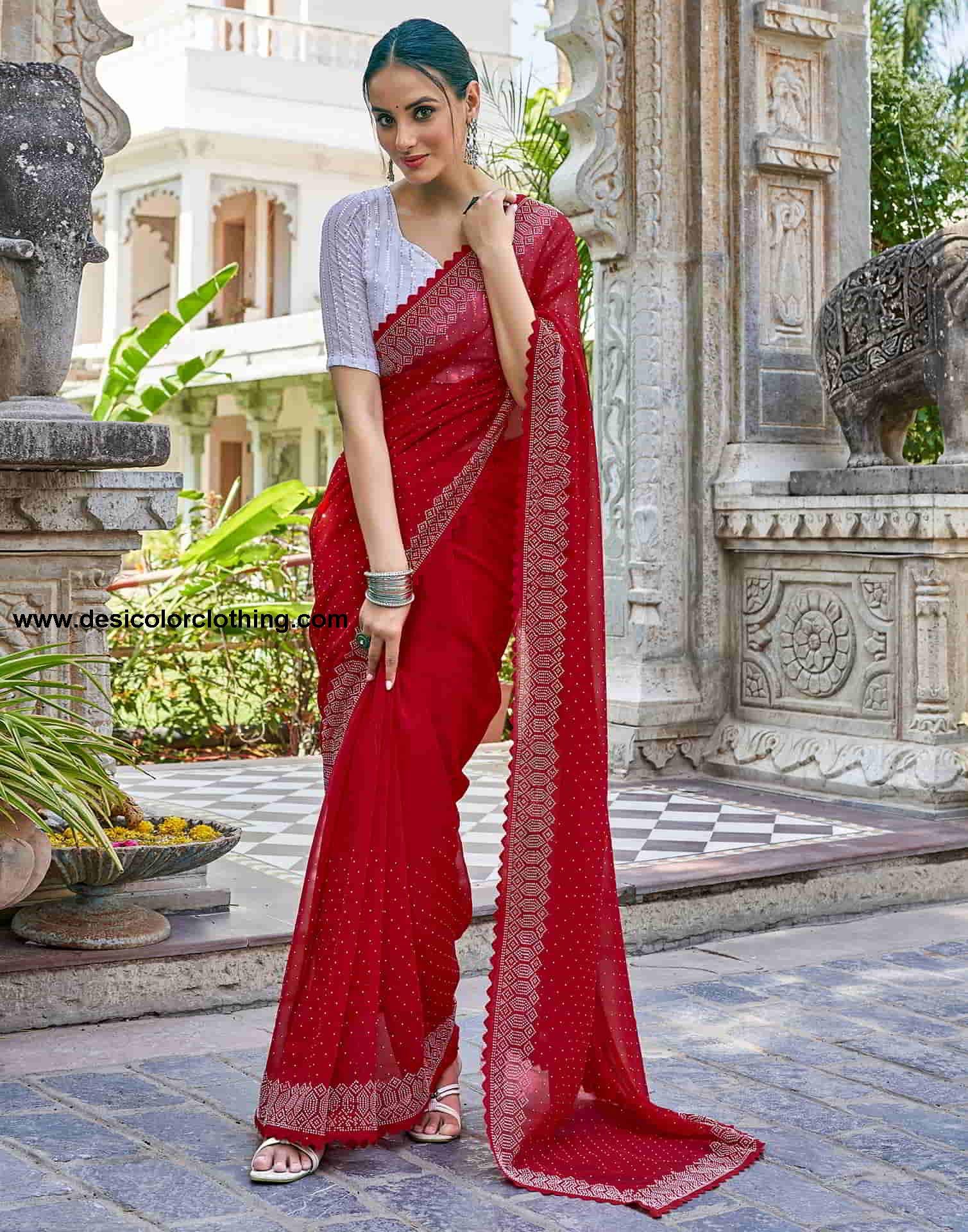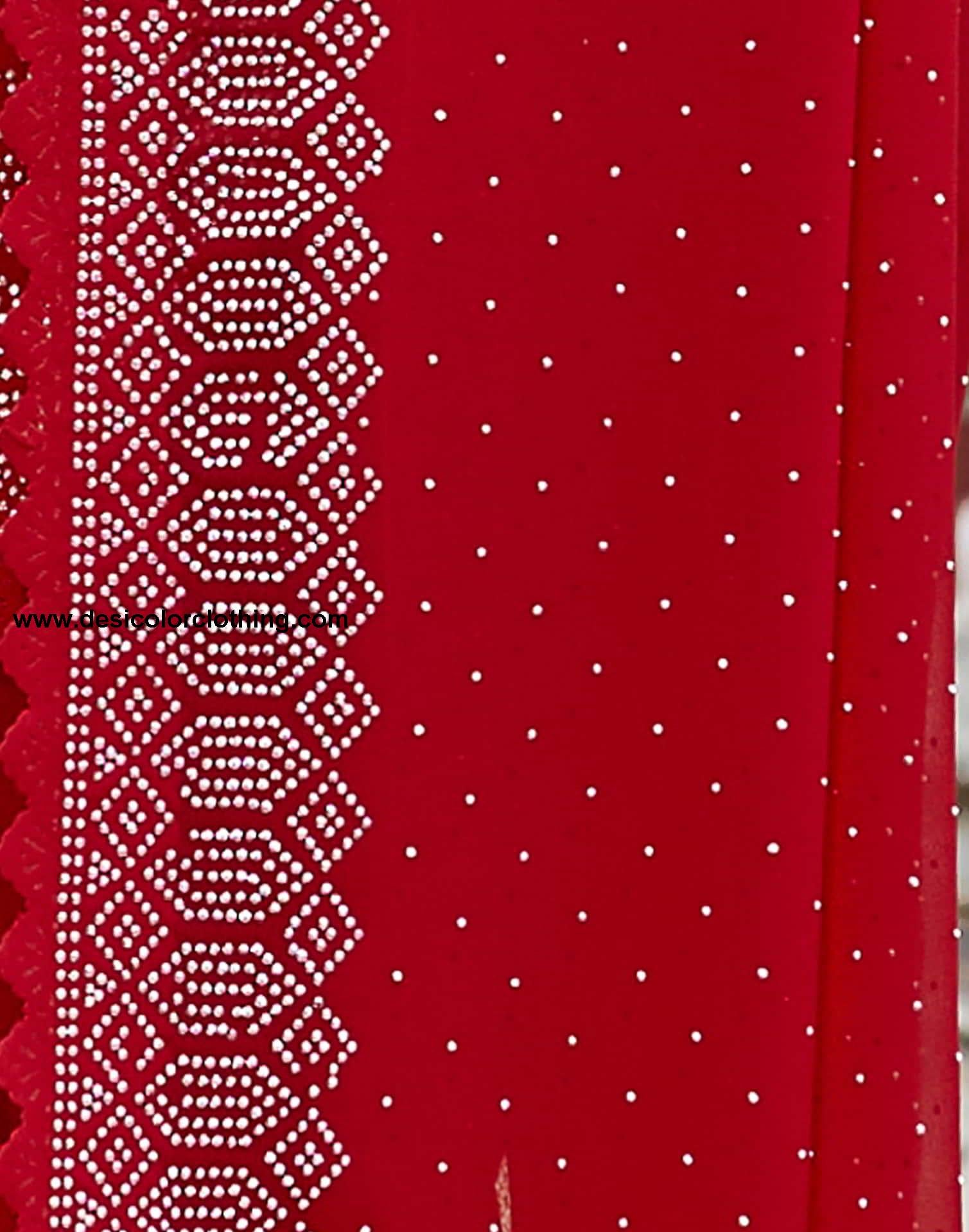 Blouse Color:White Blouse Fabric:Georgette Blouse Length:0.80 Mtr Blouse Work:Sequence Embroidery Saree Color:Red, Silver Saree Fabric:Georgette Saree Length:5.30 Mtr Saree Work:Plain, Stone Work Type:Embellished