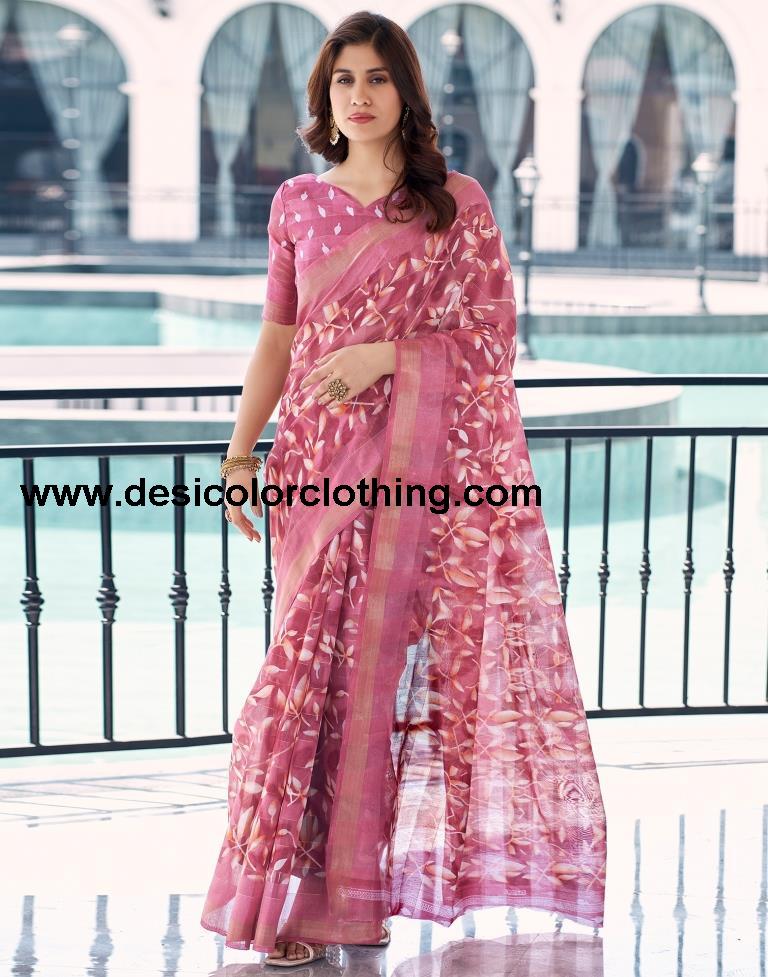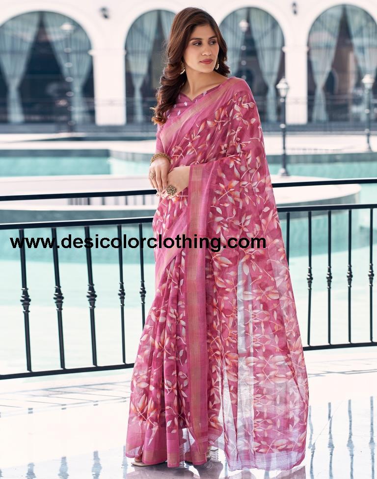 Blouse Color:Rose Pink Blouse Fabric:Poly Cotton Blouse Length:0.70 Mtr Blouse Work:Floral Printed, Woven Zari Stripe, Zari Border Saree Color:Rose Pink Saree Fabric:Poly Cotton Saree Length:5.30 Mtr Saree Work:Floral Printed, Woven Zari Stripe, Zari Border