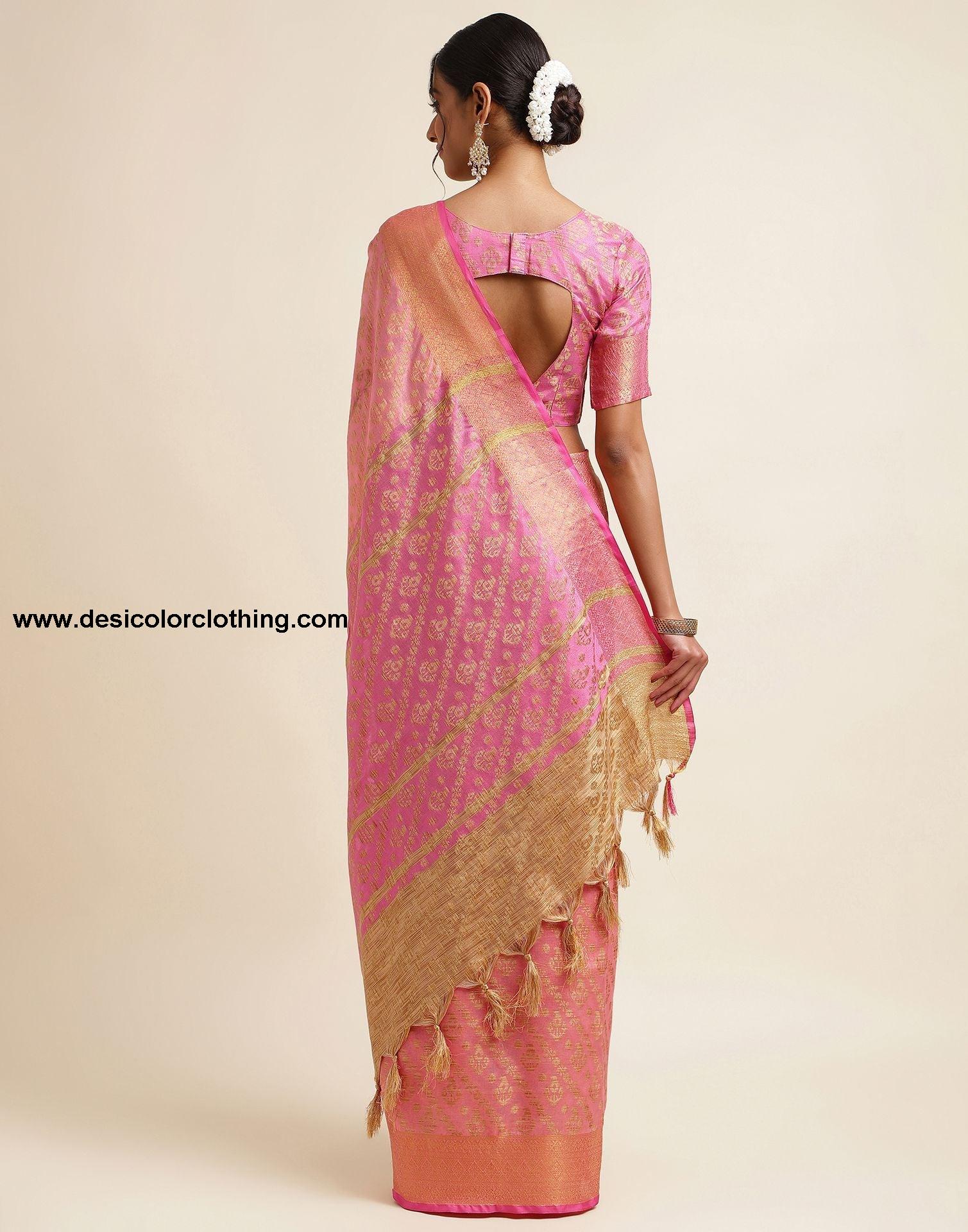 Blouse Color:Pink, Beige Blouse Fabric:Cotton Silk Blouse Length:0.80 Mtr Blouse Work:Jacquard Saree Color:Rose Pink, Beige Saree Fabric:Cotton Silk Saree Length:5.30 Mtr Saree Work:Jacquard, Tassel Type:Banarasi