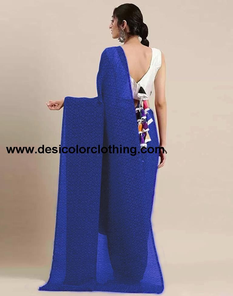 Blouse Color:White Blouse Fabric:Georgette Blouse Length:0.80 Mtr Blouse Work:Plain (Crushed) Saree Color:Royal Blue Saree Fabric:Georgette Saree Length:5.50 Mtr Saree Work:Bandhani Printed (Crushed)