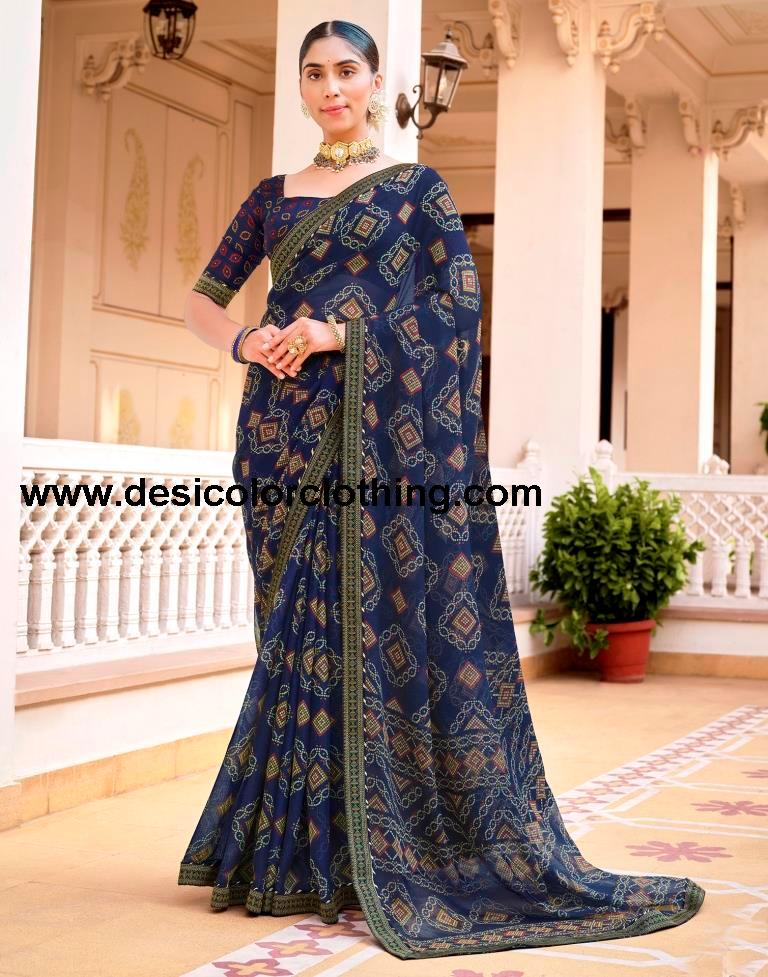 Blouse Color:Royal Blue, Multi Blouse Fabric:Dola Silk Blouse Length:0.80 Mtr Blouse Work:Bandhani Printed, Lace Saree Color:Royal Blue, Multi Saree Fabric:Chiffon Saree Length:5.30 Mtr Saree Work:Bandhani Printed, Lace
