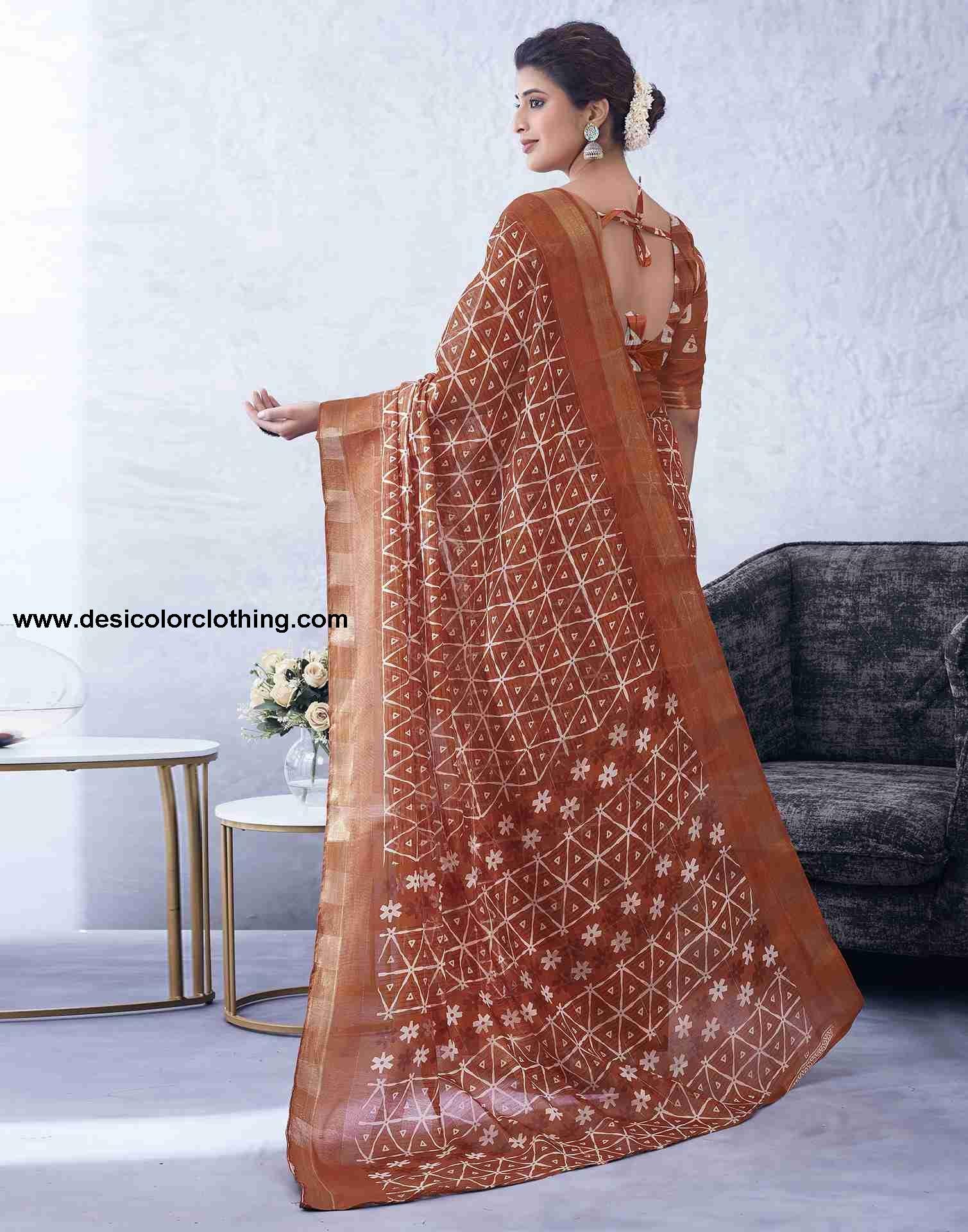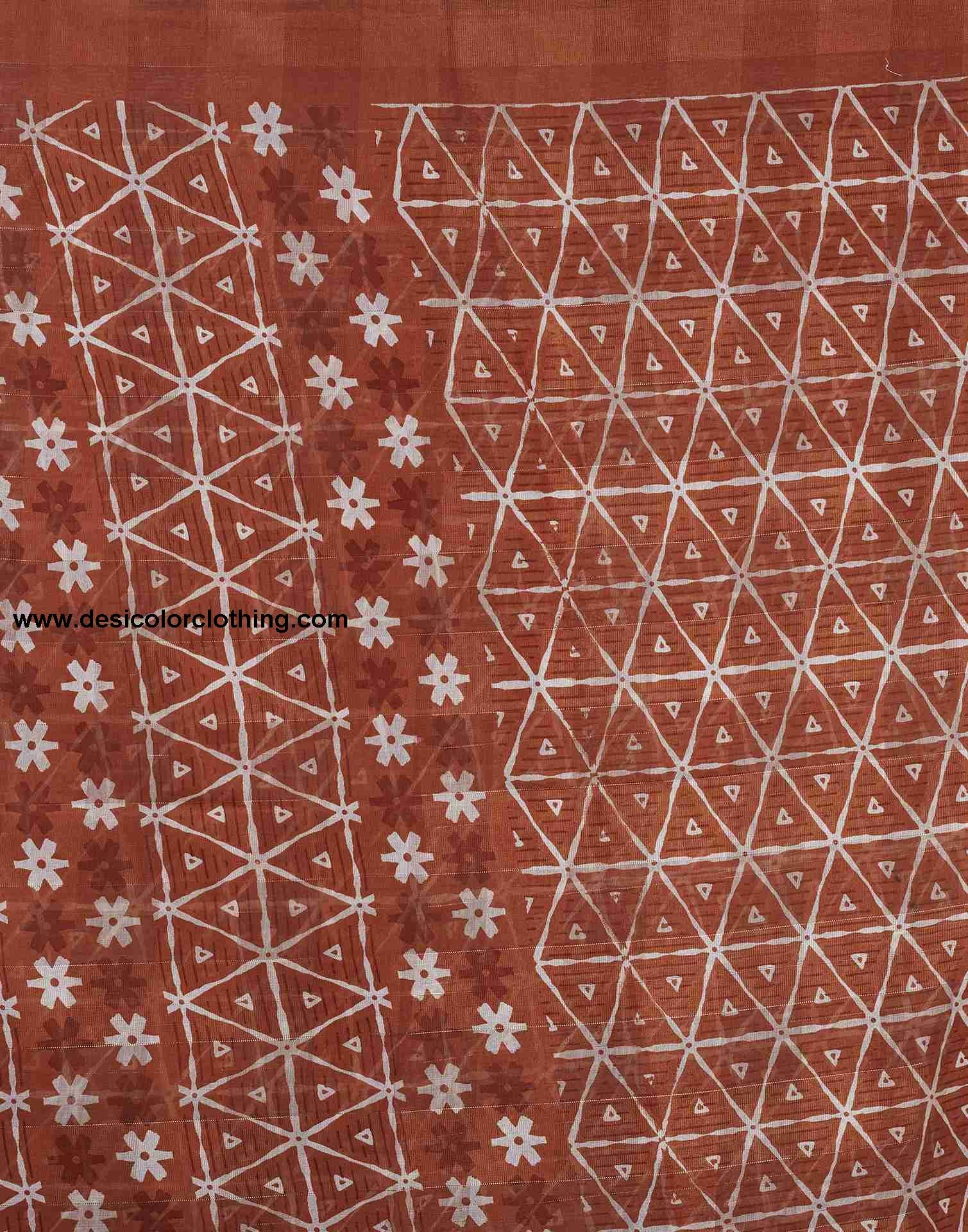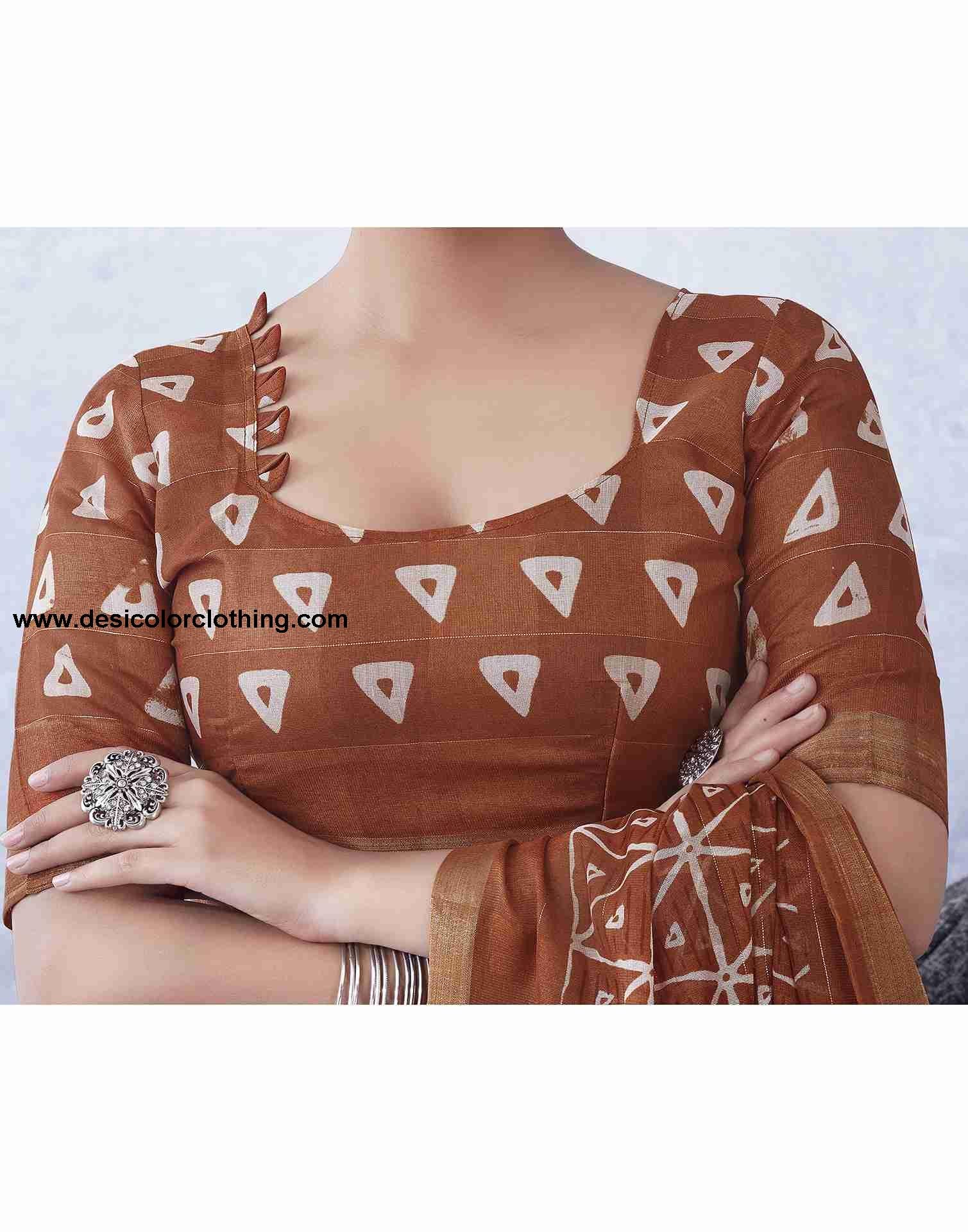 Blouse Color:Rust, White Blouse Fabric:Cotton Blend Blouse Length:0.80 Mtr Blouse Work:Geometric Printed, Zari Stripe Saree Color:Rust, White Saree Fabric:Cotton Blend Saree Length:5.30 Mtr Saree Work:Geometric Printed, Zari Stripe