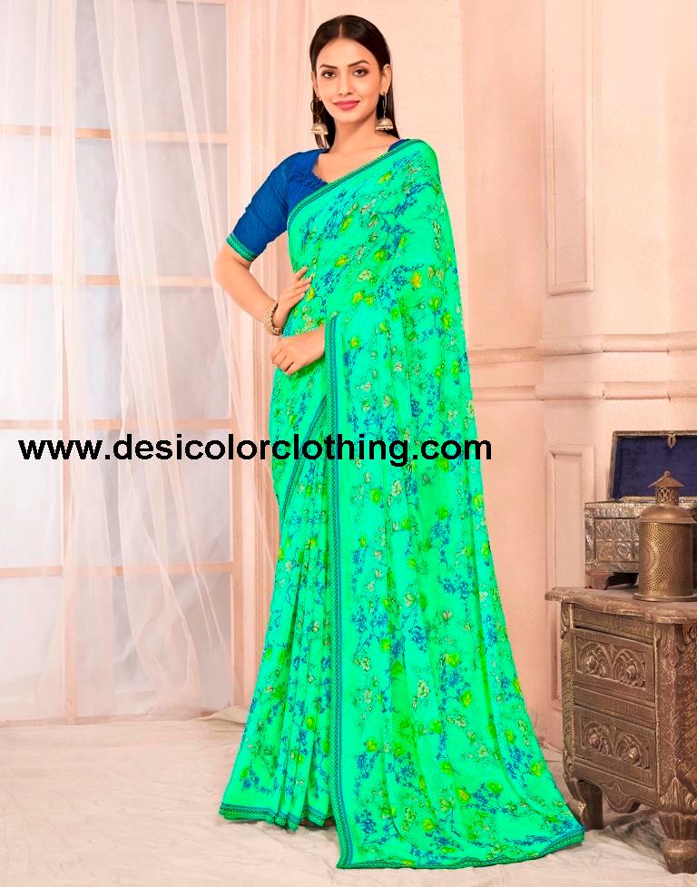 Blouse Color:Dark Blue Blouse Fabric:Chiffon Blouse Length:0.80 Mtr Blouse Work:Geometric Printed, Lace Saree Color:Seafoam Green, Multi Saree Fabric:Chiffon Saree Length:5.50 Mtr Saree Work:Floral Printed, Lace