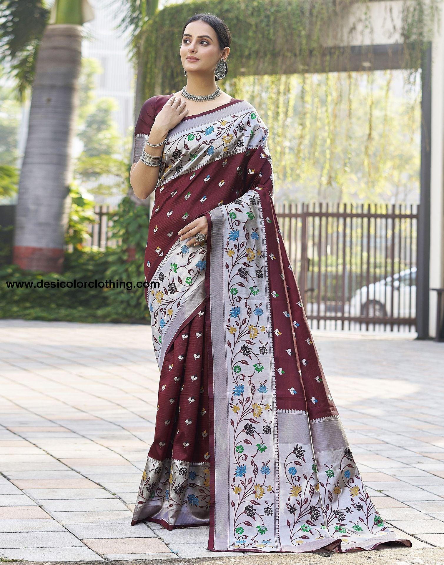 Blouse Color:Maroon Blouse Fabric:Art Silk Blouse Length:0.80 Mtr Blouse Work:Jacquard Border Saree Color:Silver Saree Fabric:Art Silk Saree Length:5.30 Mtr Saree Work:Jacquard