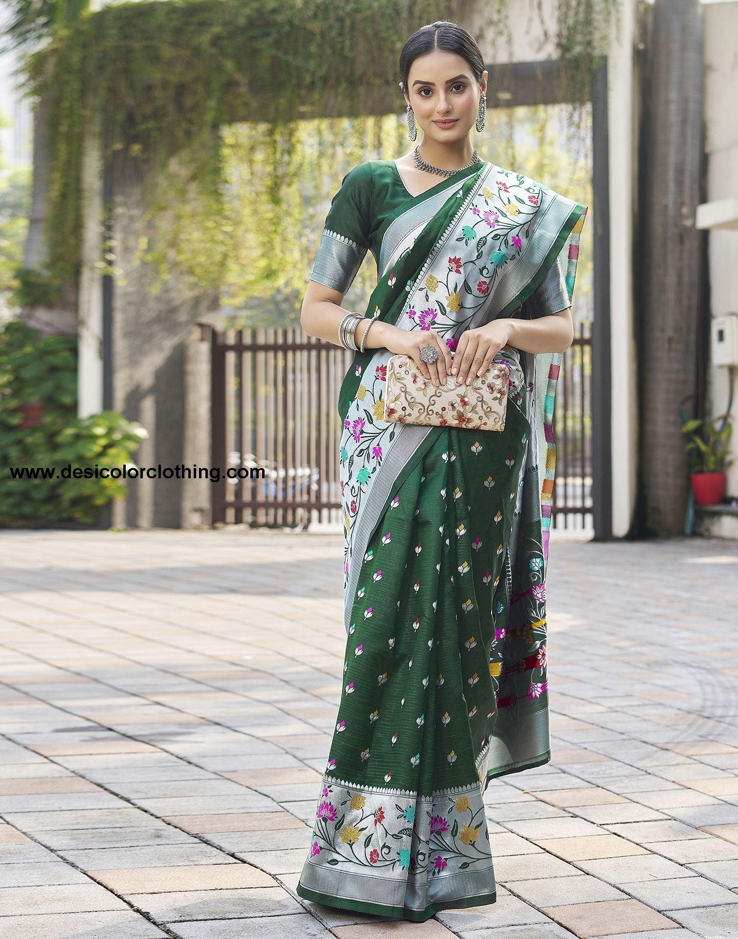 Blouse Color:Dark Green Blouse Fabric:Art Silk Blouse Length:0.80 Mtr Blouse Work:Jacquard Border Saree Color:Silver Saree Fabric:Art Silk Saree Length:5.30 Mtr Saree Work:Jacquard