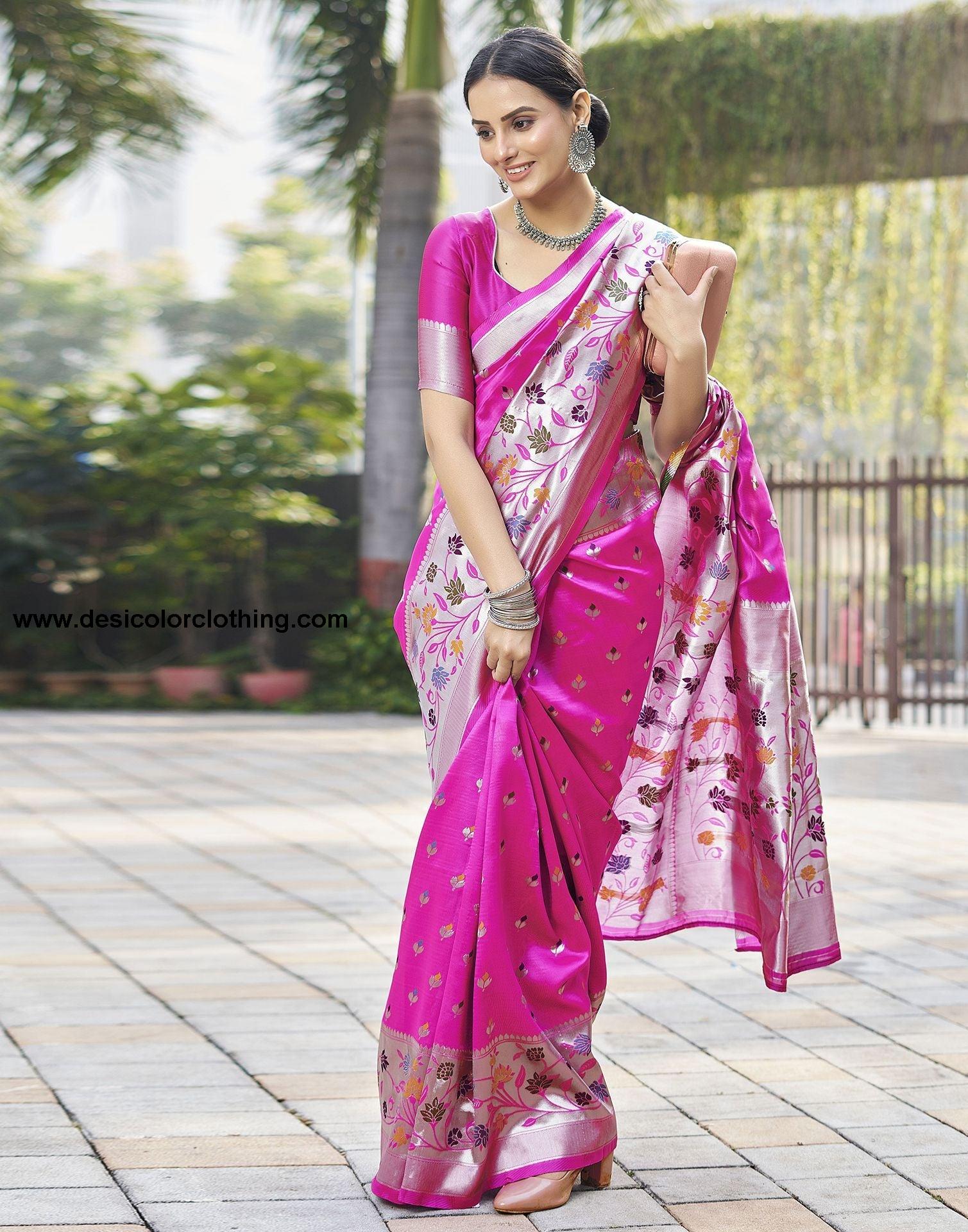 Blouse Color:Pink Blouse Fabric:Art Silk Blouse Length:0.80 Mtr Blouse Work:Jacquard Border Saree Color:Silver Saree Fabric:Art Silk Saree Length:5.30 Mtr Saree Work:Jacquard